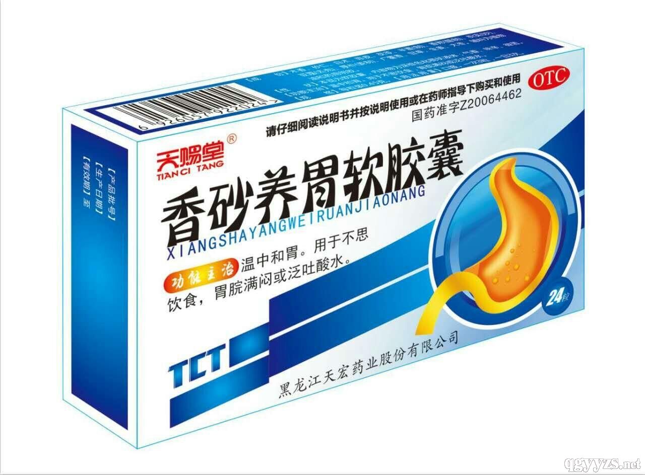Drug name: Xiangsha Yangwei Soft Capsules Product categories: Traditional Chinese Medicine Production unit: Tianhong Pharmaceutical Co.,LTD.,Heilongjiang Approval number: guo yao zhun zi No.Z20064462 ; specifications: 24pieces Usage and dosage: Oral, 3 pieces once and 3 times daily.
