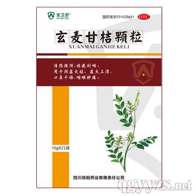 Drug name: 10g*21 Xuanmaiganju Granules Product categories: Traditional Chinese Medicine Production unit: Xuyang Pharmaceutical Co.,LTD,Sichuan. Approval number: guo yao zhun zi No.Z51022451 specifications: 10g*21*60 ingredients: Radix scrophulariae, radix ophiopogonis, radix glycyrrhizae, radix platycodi,etc. Usage and dosage: With boild water,10 once and three or three times daily.