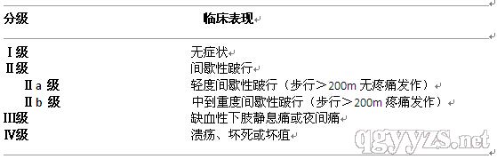 (1)症状:本病好发于50岁以上男性,早期无症状,或有肢体麻木、发凉等不适,逐渐出现间歇性跛行,行走时下肢酸胀、痉挛、疼痛等,休息后可缓解。进一步发展即使休息时也可发生炙端缺血症状。临床分级;