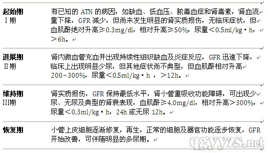 AKI的早期诊断常常基于实验室检查异常,特别是血肌酐的升高,而不是基于临床症状和体征。急性肾小管坏死(ATN)是肾性AKI最常见的类型,其临床病程可分为四期。