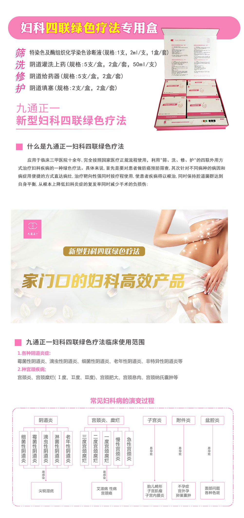 本品适用于宫颈糜烂、宫颈纳囊、宫颈息肉、宫颈肥大等宫颈炎症、各类阴道炎症的抗炎修复治疗,筛、洗、修、护,一站式妇科服务。产品适用于医院、门诊、美容院、康养中心