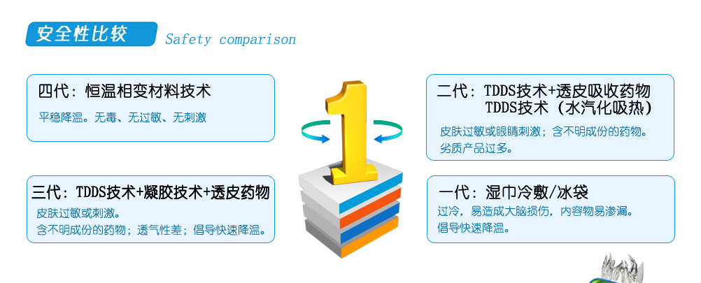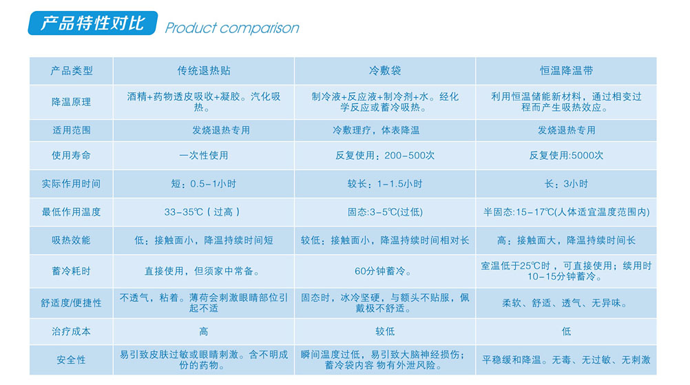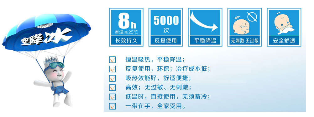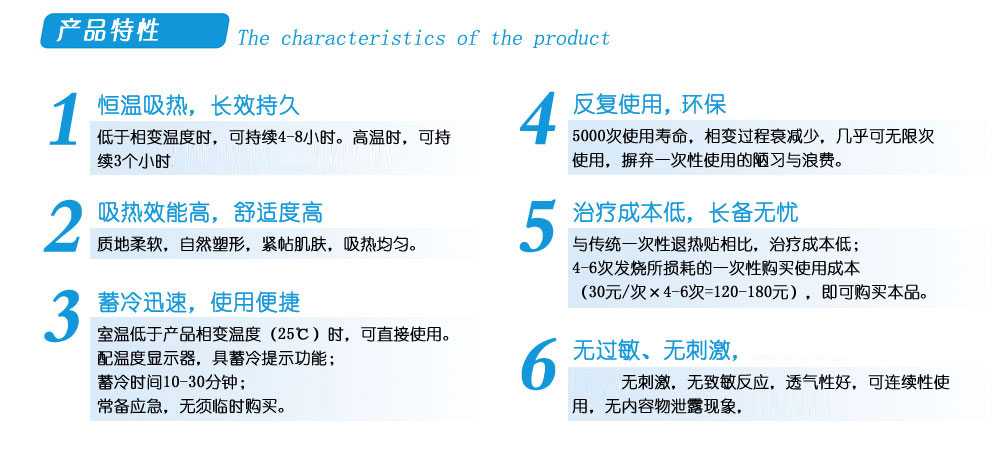国家专利,第四代物理降温产品,市场无同类竞争。优于退热贴,25度恒温,重复使用5000次。利润高,市场广,买点鲜明。适合做OTC、妇保所、幼儿诊所等渠道。