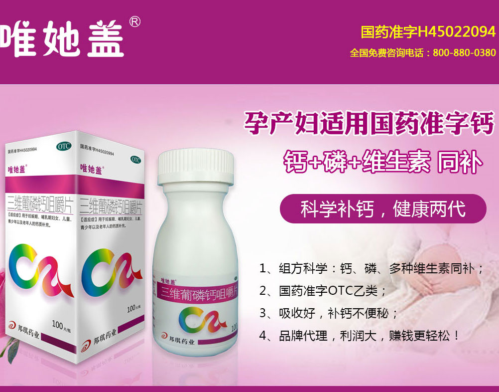 | 【产品卖点】 | 唯她盖,孕产妇适用国药准字钙! (组方好,选料好,口感好,吸收好,品牌好) 1、组方科学,复合钙: 独具有机钙和无机钙双重钙源(葡萄糖酸钙+磷酸氢钙)和三大成长维生素(VD2、VB1、VB2)的黄金配比,是适合孕妇和哺乳期妇女的补钙制剂; 2、钙、磷、多种维生素同补: 唯她盖所含钙、磷、多种维生素黄金搭配,组方更易转化,益于宝宝骨骼成长; 3、国药准字OTC乙类; 4、服用方便,吸收快: 咀嚼片口感好,嚼着吃,方便,吸收快; 5、独特包装设计,更贴心; 瓶盖“唯她盖”起凸品牌设计,认可度高于普通瓶体包装,瓶体流线圆润,妈妈更喜欢; 6、名厂名药,值得信赖: 由邦琪药业集团的总厂生产上市。采用高等级原料药,集团总工全程严格控制生产工艺流程,确保每一片唯她盖的高品质。 |