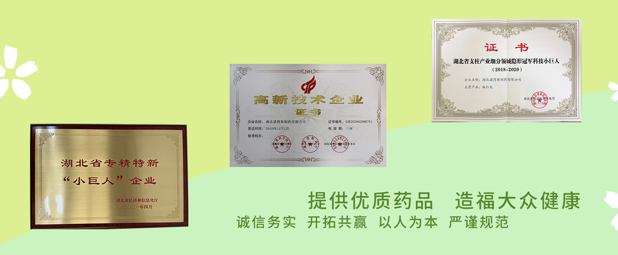 公司多次荣获“湖北省守合同重信用企业”、“工商税收贡献大户”、“纳税贡献优秀单位”等荣誉称号;“诺得胜”商标被认定为湖北省著名商标;2017年荣获“湖北省高新技术企业”荣誉称号,2018年荣获“湖北省支柱产业细分领域隐形冠军科技小巨人”荣誉,经过60多年艰苦创业,60多年厚积薄发,正朝着现代化、规模化、品牌化的行业目标迈进,已跻身湖北省中成药生产企业先进行列,由一家区域品牌跃升至全国优秀品牌。