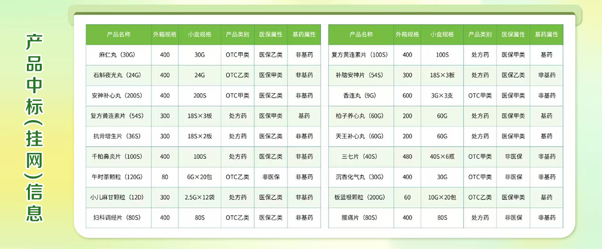 公司拥有“麻仁丸”、“石斛夜光丸”、“复方黄连素片”、“午时茶颗粒”、“安眠补脑口服液”、“鼻渊糖浆”、“安神益脑丸”、“小儿麻甘颗粒”、“稚儿灵膏滋”、“归脾膏”等全国控销品种,产品涵盖丸剂、片剂、颗粒剂、口服液、散剂、糖浆剂、煎膏剂、露剂等中成药剂型。