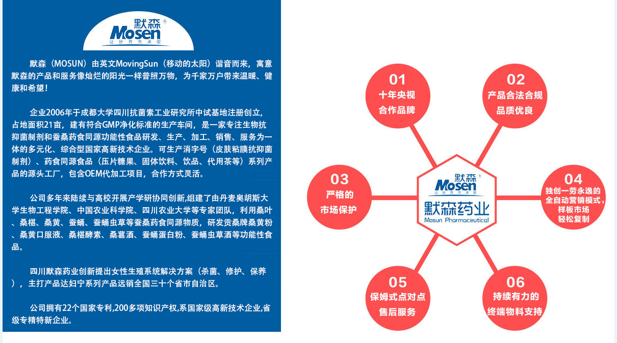 四川默森药业有限公司产品展示列表, 技术支持:环球医药招商网 (招商频道-医药代理-otc-处方药) 版权所有,违版必究免责声明:环球医药网只起到信息平台作用,不为交易经过负任何责任,请双方谨慎交易,以确保您的权益。风险提示:招商项目有风险,投资合作需谨慎。