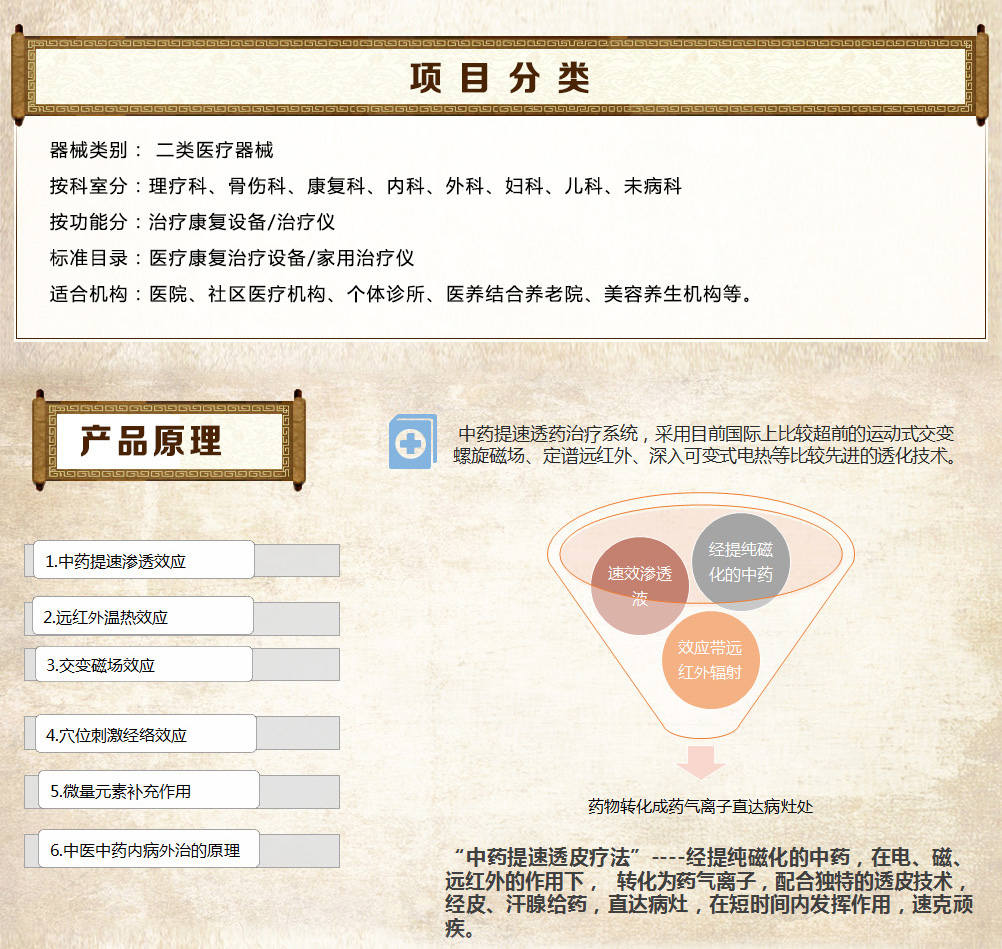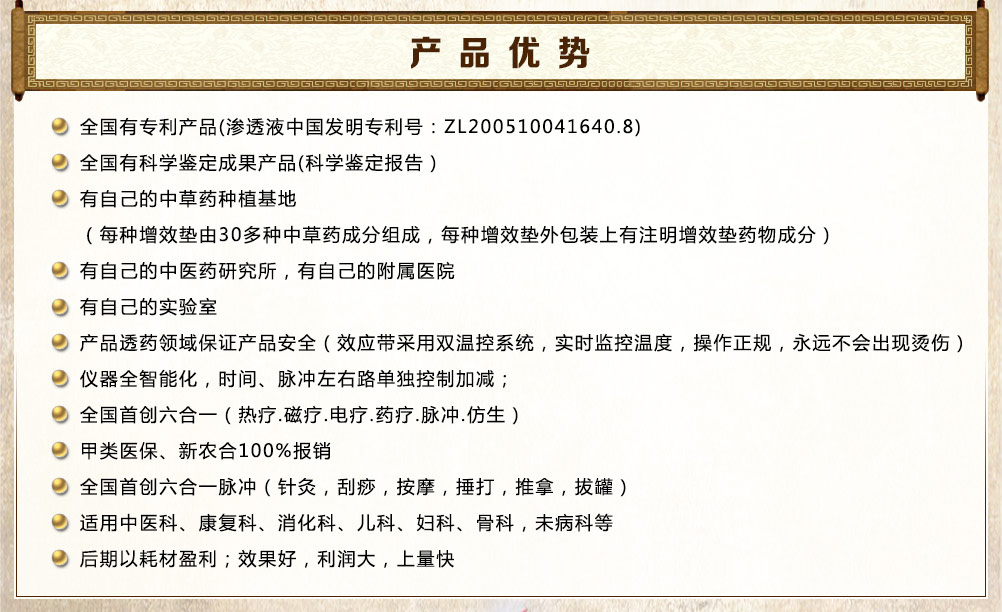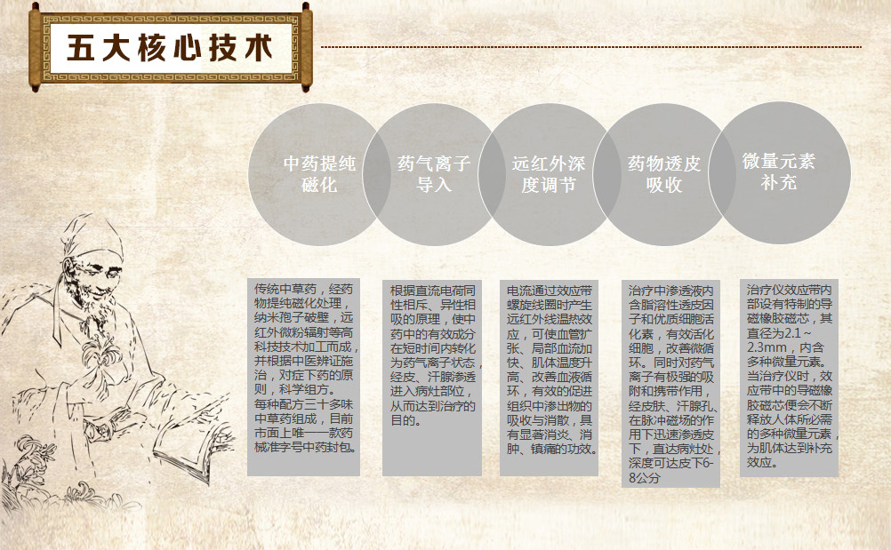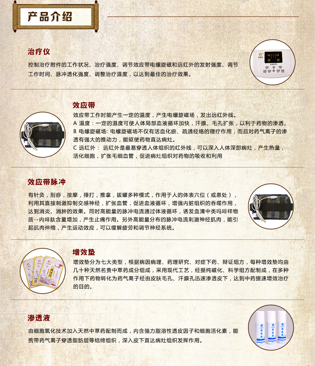 增效垫分为七大类型,根据病因病理、药理研究、对症下药、辩证组方,每种增效垫均由几十种天然名贵中草药成分组成,采用现代工艺,经提纯磁化、科学组方配制成,在多种作用下药物转化为药气离子经由皮肤毛孔、汗腺孔迅速渗透皮下,达到中药提速增效治疗的目的。 |