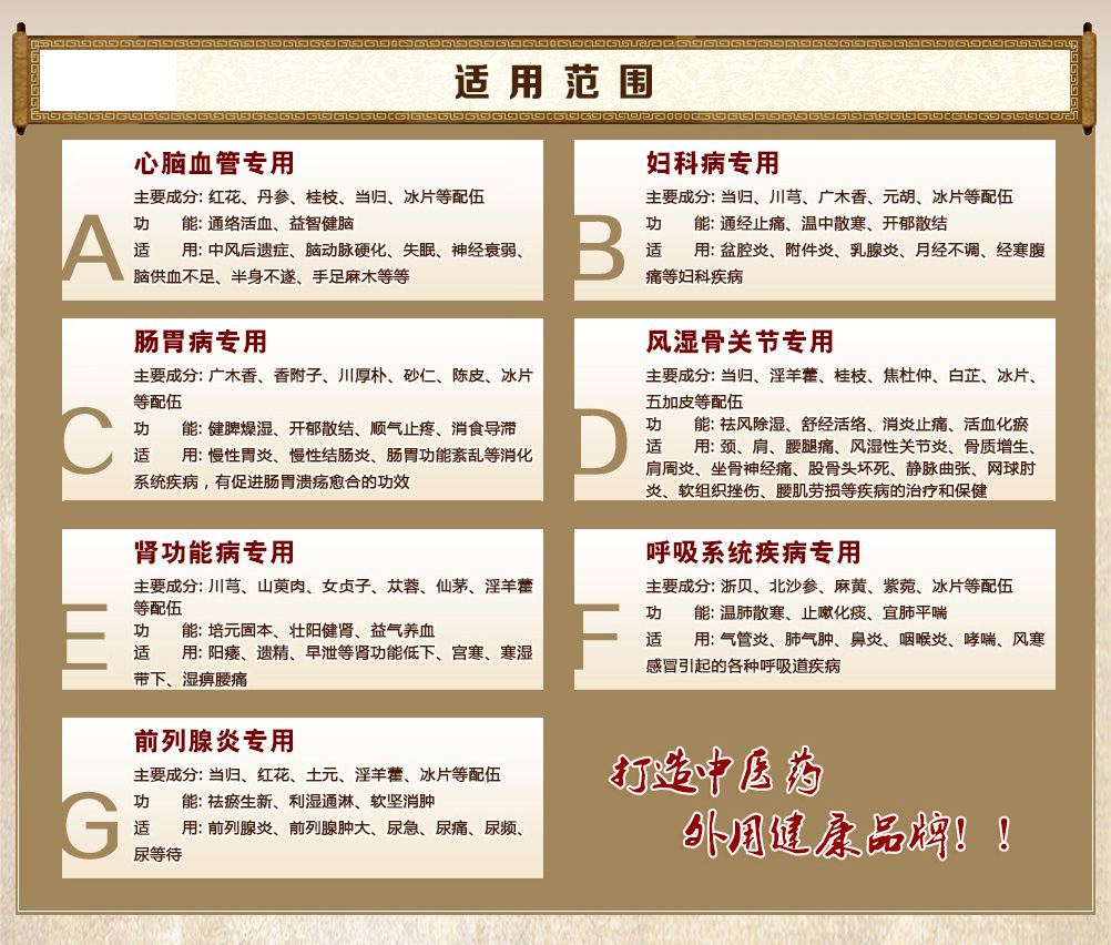 适用于风湿性关节炎、老年性骨关节炎、风寒胃痛、风寒感冒、慢性支气管炎、腹痛、妇女痛经、慢性附件炎、肩周炎、颈椎病、坐骨神经痛、网球肘炎、风湿、冻疮、软组织挫伤、腰肌劳损、前列腺炎、前列腺肥大、胃肠功能紊乱,中风后遗症伴随肢体麻木等疾病的辅助治疗和保健。 |