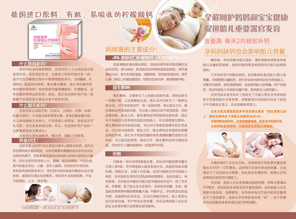 | 【产品卖点】 | 国家食品药品监督管理总局批准的孕妇专用营养补充剂,采用德国进口有机钙(柠檬酸钙),有机钙易吸收,对肠胃无刺激,而且不会造成结石及便秘; 2、处方三味孕妇必需营养成分黄金组合:柠檬酸钙、叶酸、维生素B6三味同补,从备孕期到哺乳期一款搞定。 |