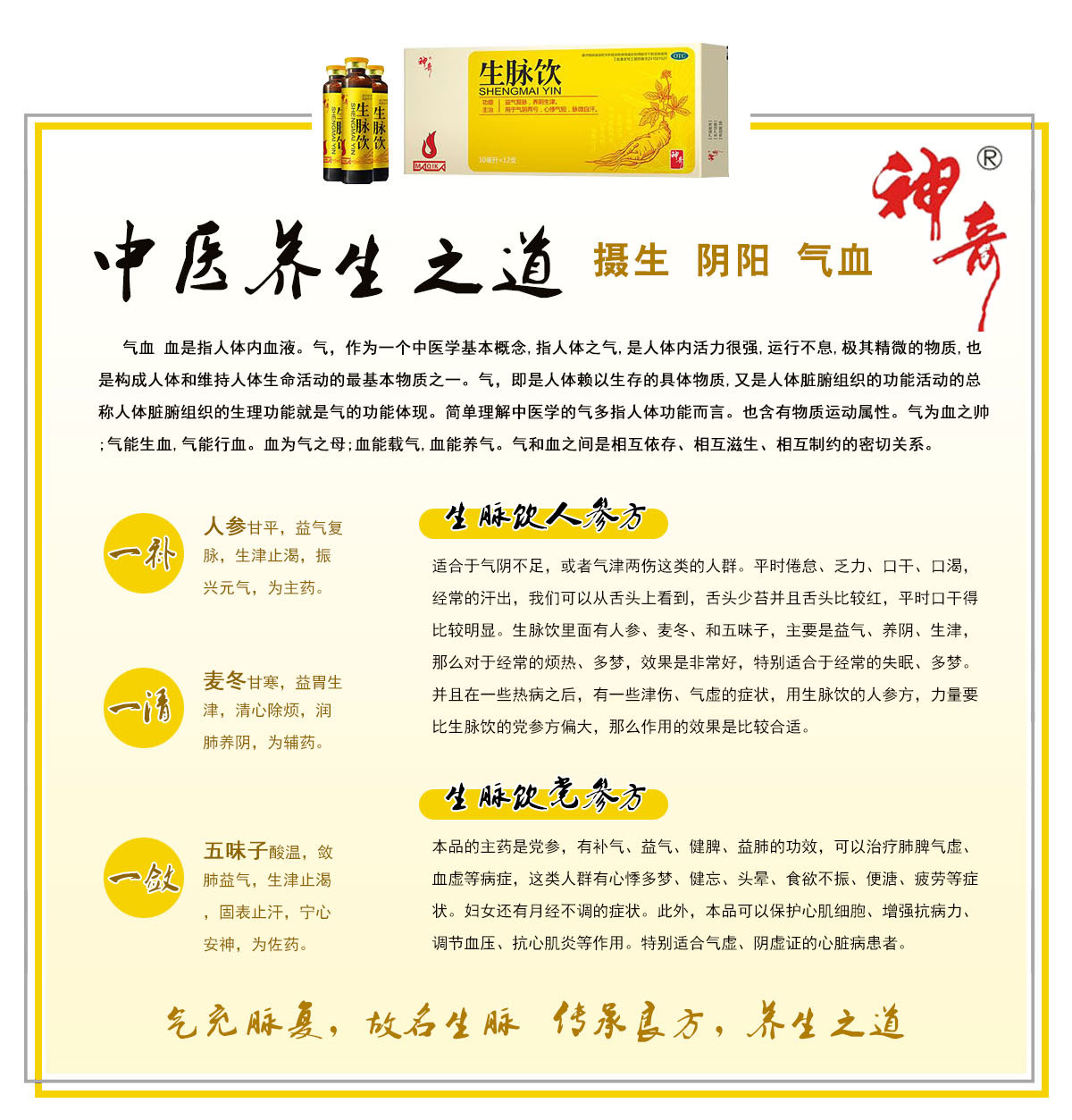 为补益剂,具有益气复脉,养阴生津之功效。用于气阴两亏,心悸气短,脉微自汗。