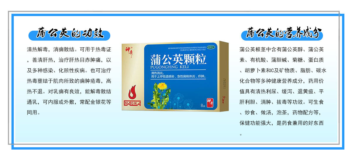 清热消炎。用于上呼吸道感染,急性扁桃体炎,疖肿,乳腺炎。