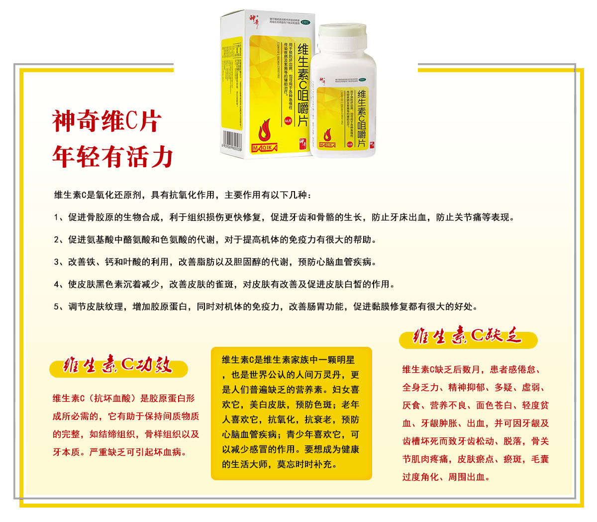 用于预防坏血病,也可用于各种急慢性传染疾病及紫癜等的辅助治疗。