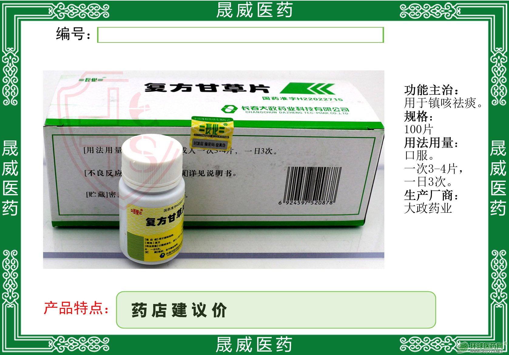| 【规 格】 | 1.0g*100片 |