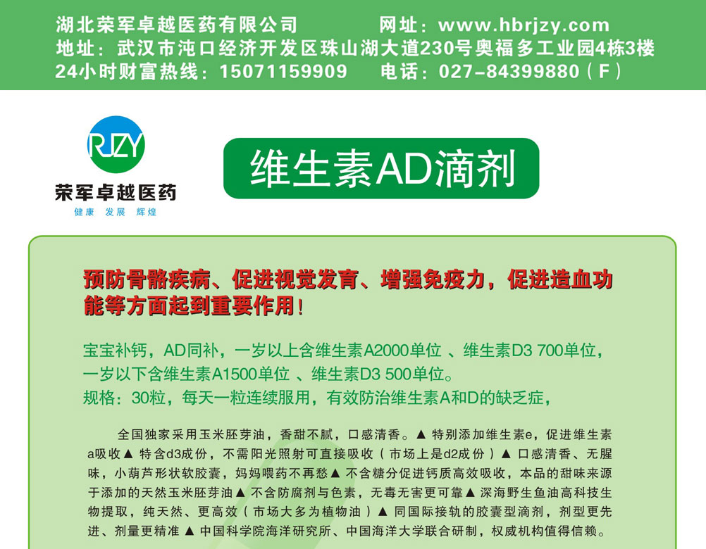| 【功能主治】 | 作用/功效:维生素AD滴剂用于预防和治疗维生素A及D的缺乏症。如佝偻病、夜盲症及小儿手足抽搐症等症状。 效果:维生素AD滴剂由维生素A及维生素D组成。维生素A和D是人体生长发育必需的物质,能够对胎儿、婴幼儿的发育,上皮组织的完整性、视力、生殖器官、血钙和磷的恒定、骨骼、牙的生长发育等起到良好的效果。 价格:目前市面上由烟台元生药业有限公司生产的0-1岁幼儿食用的维生素AD滴剂(胶囊型)的市场零售价格为25元每盒,详细的代理/招商价格可通过下方联系方式与厂家联系,也可直接留言给我们。 |