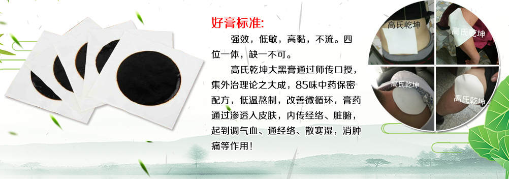潍坊乾坤生物科技有限公司是一家专业进行生物技术研发,技术咨询,技术转让,技术服务,销售各种医疗器械,中药材,进行健康信息咨询的综合性公司。以纯手工熬制的300多年****大黑膏药为主打产品, 贴膏药疗法是中医临床常用的外治方法之一,**大黑膏药遵循中医辨证论治及中药的功效、主治与归经的原则,充分调动药物互相协调为用的效能,组成多味药物的复方,以发挥药物的良好效果。膏药直接敷贴于体表,制作膏剂的药物再加入辛香走窜极强的引经药物,通过渗透入皮肤,内传经络、脏腑,起到调气血、通经络、散寒湿,消肿痛等作用。 可以风寒湿邪所致的肩周炎,腰椎间盘突出,腰肌劳损,风湿性关节炎,颈椎病,坐骨神经痛等病症。成效**,标本兼治,潍坊乾坤生物科技有限公司以好的口碑,和信誉赢得了广大用户的信赖!