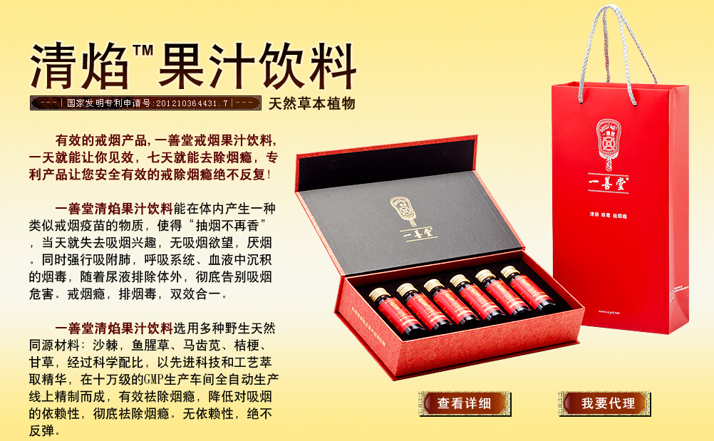 我司现以'' 一善堂 "为旗下核心品牌,目前产品主要涵盖快速戒烟,戒毒,抗疲劳类,挺高免疫力,保健养生等几大类,受到政府、学术界和大众的关注及支持,为满足市场不断需求我们将携手国内知名科研单位紧密合作,共同研发更多优质的健康产品,若能得到您的信任,将是我们毕生的荣幸!