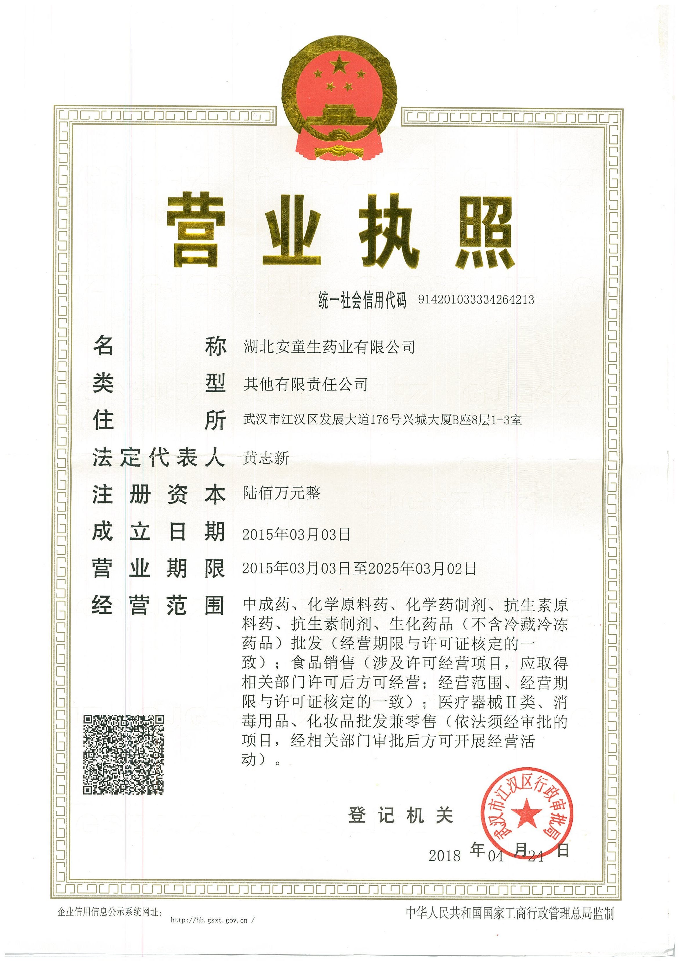 湖北安童生药业有限公司是一家以研发、生产、咨询、策划、营销、服务为一体的综合型股份制企业。经营产品涵盖:药品、保健品、医疗器械等几大系列。公司位于九省通衡的华中工重镇武汉市,地处汉口发展大道176号兴城大厦(汉口火车站正对面)B座8层,地理位置处在商业圈正中心,交通发达且便利,办公场所及仓库有10000余平方米。公司内设小亮仔品牌部、叶天师品牌部、葫芦兄弟品牌部、临床基药配送部、湖北OTC事业部、市场服务部、市场巡视中心等核心部门。公司现有员工170余人,其中具有大专以上学历者占80%,各类专业技术人员占员工总数85%以上,为给全国药界朋友提供优质的服务,打下了坚实的基础。
