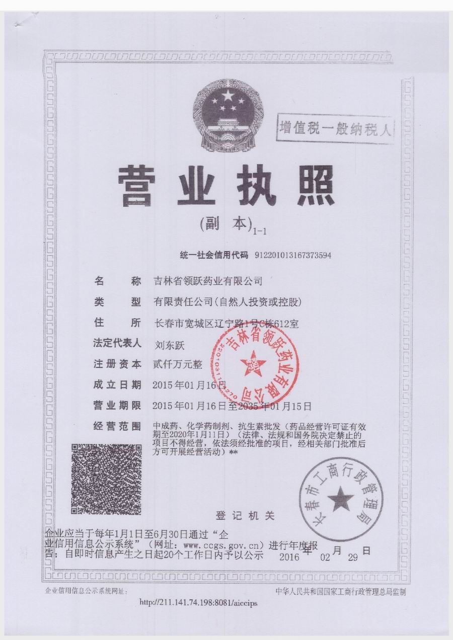吉林省领跃药业有限公司隶属于领跃集团,领跃集团是一家集保健品(国食健字)、医疗器械(卡波姆凝胶系列、一类贴剂、)、体外诊断试剂、消毒产品、卫生用品、药品的研发、生产及销售于一体的成长型新型医药集团企业,旗下同时拥有吉林省领跃生物科技工程有限公司、吉林省国大制药有限公司。