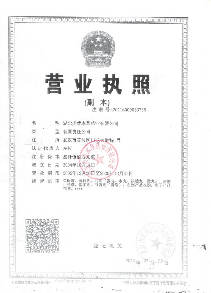 炎黄本草药业秉承炎黄先祖“遍尝百草、以医民恙”之精神,“选好材,制好药,为百姓”,始终将质量放在位,品质当先,诚信为重,服务大众。多年来公司一直与客户务实合作,踏实经营,稳步发展,得到各级政府、社会人士和广大民众的广泛赞誉。2006年,公司被评定为高新技术企业;2009年,一次性**通过国家GMP认证;2010年,公司获得湖北省知名商标称号。