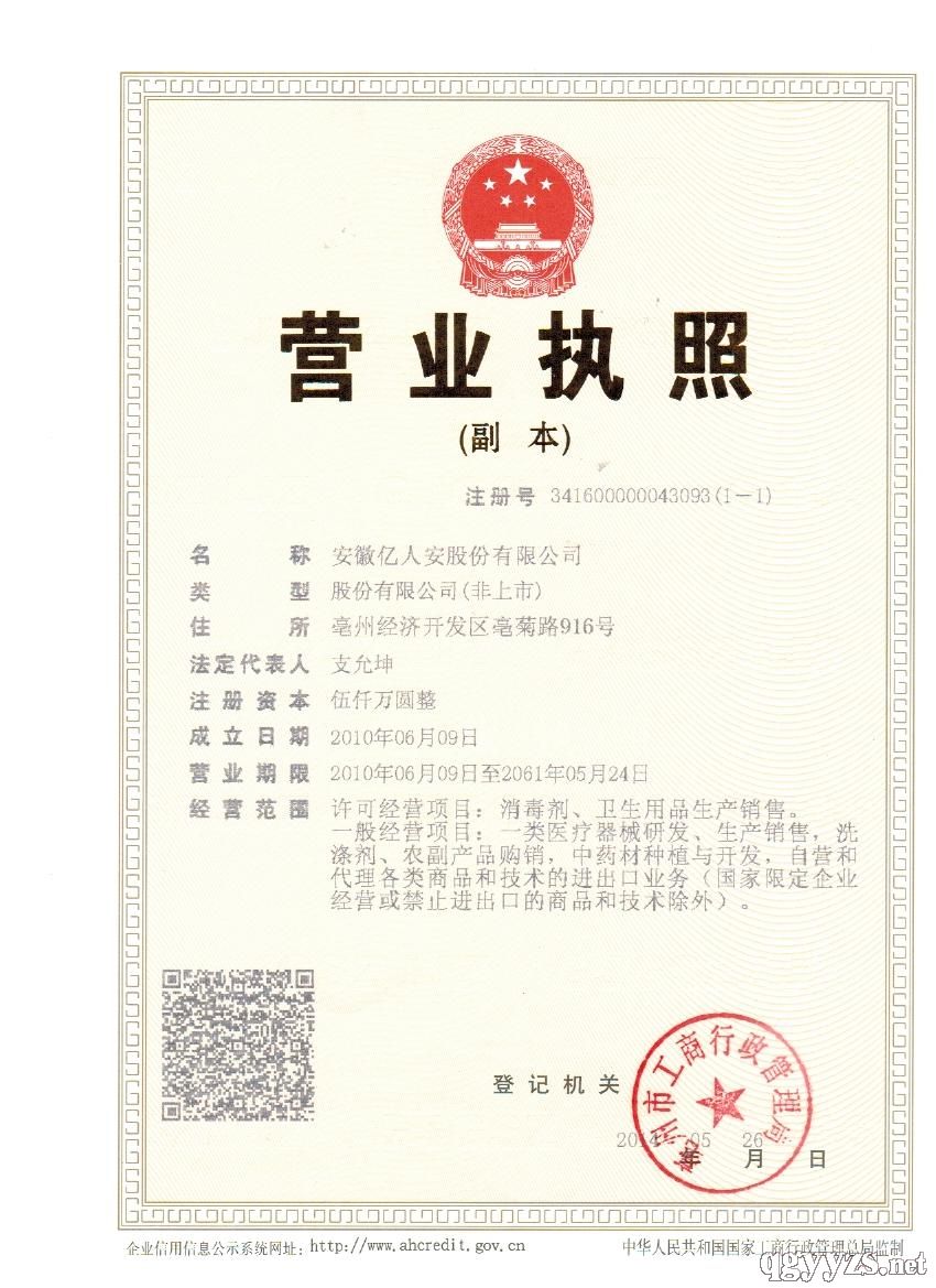 “中药消毒领导品牌”---安徽亿人安股份有限公司,坐落于美丽的长寿之乡,安徽.亳州经济技术开发区亳菊路916号,公司占地2.06万平方;建筑面积1.5万平方。总资产8000余万元,股份代码:800038。“亿人安项目”被市委市政府列为我市“中药十大产业”之一;自2011年投产以来,已获得自主发明专利和商标证书数十件,先后获得亳州经开区项目建设“先进单位”、“知名商标“、“守合同重信用企业”、“高新技术企业”、“农业产业化优秀龙头企业”、“诚信民营企业”、“创业带头人”、“安徽省技术改造先进企业及先进个人”、“安徽省生产线示范单位”、“科技攻关计划承担企业”等殊荣。亿人安植物消毒液和抗(抑)菌剂,在引进安徽中医药大学的先进技术的基础上;再消化吸收与开发创新,探索出了一条拥有核心专利技术的纯中药杀菌剂的市场蓝海,技术路线是:从中药材中提取抗菌、抑菌和杀菌活性成份;再根据生物分子的选择性,通过集成膜分离纯化技术,精制而成的高效环保消毒液,其配方及生产工艺已达国际先进水平,产品经过安徽中医药大学、安徽省和江苏省疾病预防控制中心等官方机构对产品的杀菌、皮肤刺激、(眼)粘膜刺激、致癌、致畸、致突变、亚急性毒理试验等数十种检测和验证,亿人安牌消毒液不但杀菌范围广、速度快,而且、***、,对人体完全无害,是十分理想的消毒液,可以广泛应用于**公共场所、医疗机构以及人体手、足、口部及其他部位皮肤消毒。目前,公司已经与上海九州通、上海复美医药集团、安徽华源医药集团等数十家客户建立了战略合作,市场规模每年以30%以上速度增长,初步建立营销网络,正在积极培育经销商客户,构建分销渠道,健全OTO营销服务体系;促进销售,完善商业模式,打造中药消毒领导品牌。