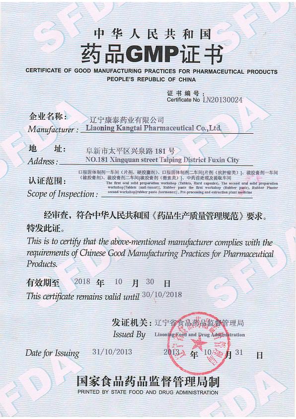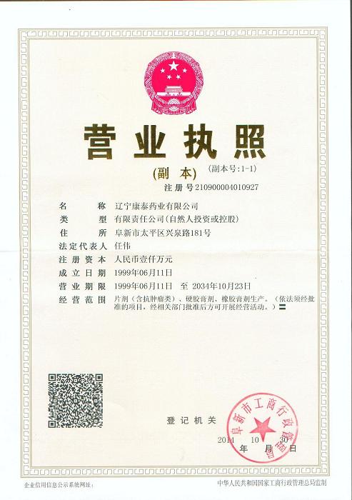 辽宁康泰药业有限公司位于辽宁西部,阜新市细河区东风路93号,占地面积9016平方米,生产及管理均达到了世界卫生组织(WHO)的要求及药品生产质量管理规范(GMP)的标准,并采用国际通行的现代企业管理制度运营管理。二〇〇三年十一月四日原阜新市第二制药厂(第二制药厂始建于一九八六年六月二十日)更名为辽宁康泰药业有限公司。我公司是以硬膏、胶囊、片剂、抗肿瘤单一生产线为主的综合制药企业。