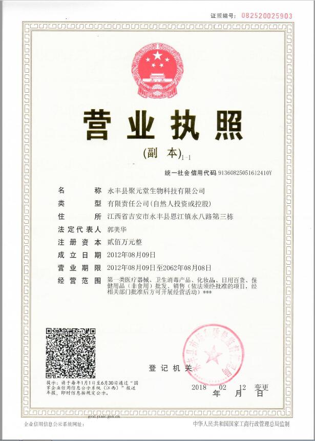 江西聚元堂生物科技有限公司坐落于人杰地灵、物华天宝的江西永丰。这里是北宋大文豪欧阳修的故里,更是现在的全国药业强县。聚元堂公司是一家集科研、销售为一体的现代化高新技术企业。公司重质量、守信誉、强素质、树形象,严格内部管理,提升服务质量,建立了与现代企业制度相适应的内部运行机制,激发了企业的内部活力,销售呈现出勃勃生机,一月一个台阶,一年一大飞跃。公司秉承”售货无诀窍,信誉条”的经营理念,努力开拓市场,销售网络遍及全国。公司坚持”全国统一价,服务人性化”的销售方针为全国经销商提供快捷周到的服务。我们在传承”守信、团结、务实、双赢”的企业精神的同时,不断改革创新,开拓进取,为人类的健康事业而奋斗不息。时代在变,但不变的是我们的合作;踏着新时期的朝阳,聚元堂公司期望与您携手共创更美好的未来。