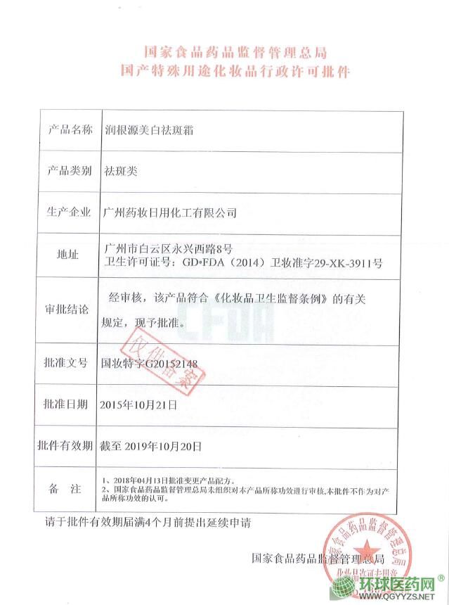 - 润根源美白祛斑霜 批准文号: 粤妆20160256规 格: 30g/50g