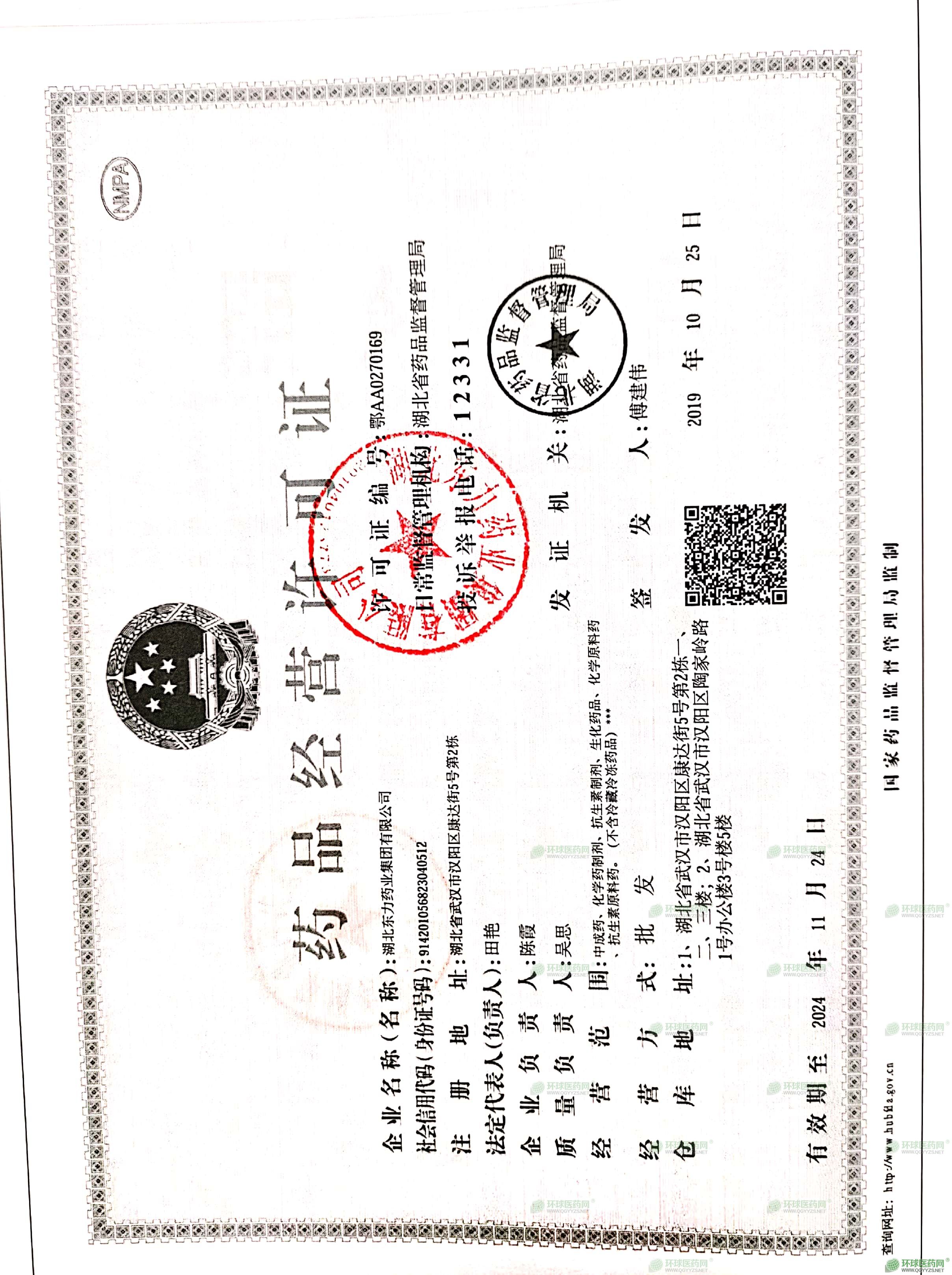 湖北东力药业集团有限公司,注册资金1000万元,位于武汉市汉阳区陶家岭康达街2号楼,占地面积约3000平方米,拥有GSP达标仓库约2000平方米。销售大厅宽敞明亮,经营范围主要有:中成药、中药饮片、中药材、化学药制剂、抗生素制剂、生化药品、生物制品批发;保健品销售等等。公司组织机构健全,各项管理制度设施设备符合药品质量管理要求,公司严格执行《药品管理法》,切实遵循《药品经营质量管理规范》,**商品的质量管理等**实施计算机管理。