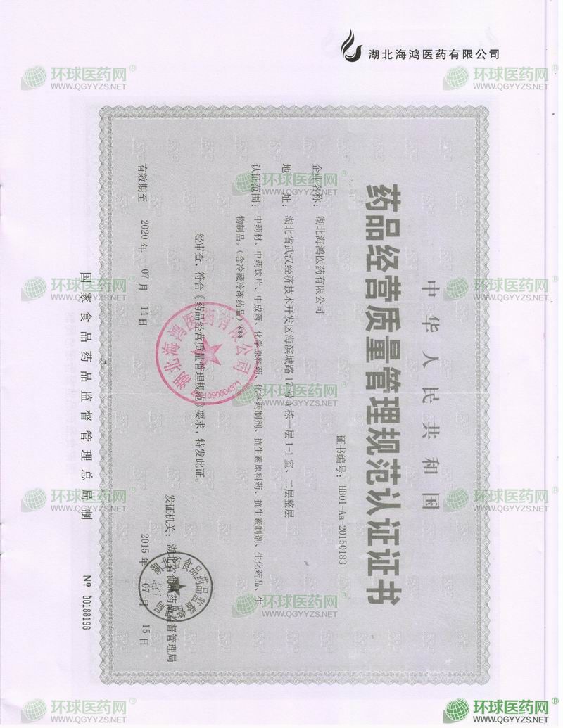 湖北海鸿医药有限公司位于龙阳大道136号,毗邻武汉市汉阳区繁华的商业圈王家湾,处于武汉市医药商圈的中心,医药气氛浓厚,交通发达,物流便利。公司已通过国家GSP认证,是一家具有法人资格的独立核算企业。公司秉承“以诚信为本,以客户满意为己任”的经营理念,严格按照GSP规定规范经营,在业界赢得了口碑,在竞争日趋烈的医药行业占有席之地。公司以销售优质药品、提供完善服务“为指导方针,诚信经营,积极拓展药品经营业务,与国瑞医药、山东罗欣、南昌立健、深圳致君、苏州二叶、广州白云山等一在批全国知名厂家建立了稳固的业务关系