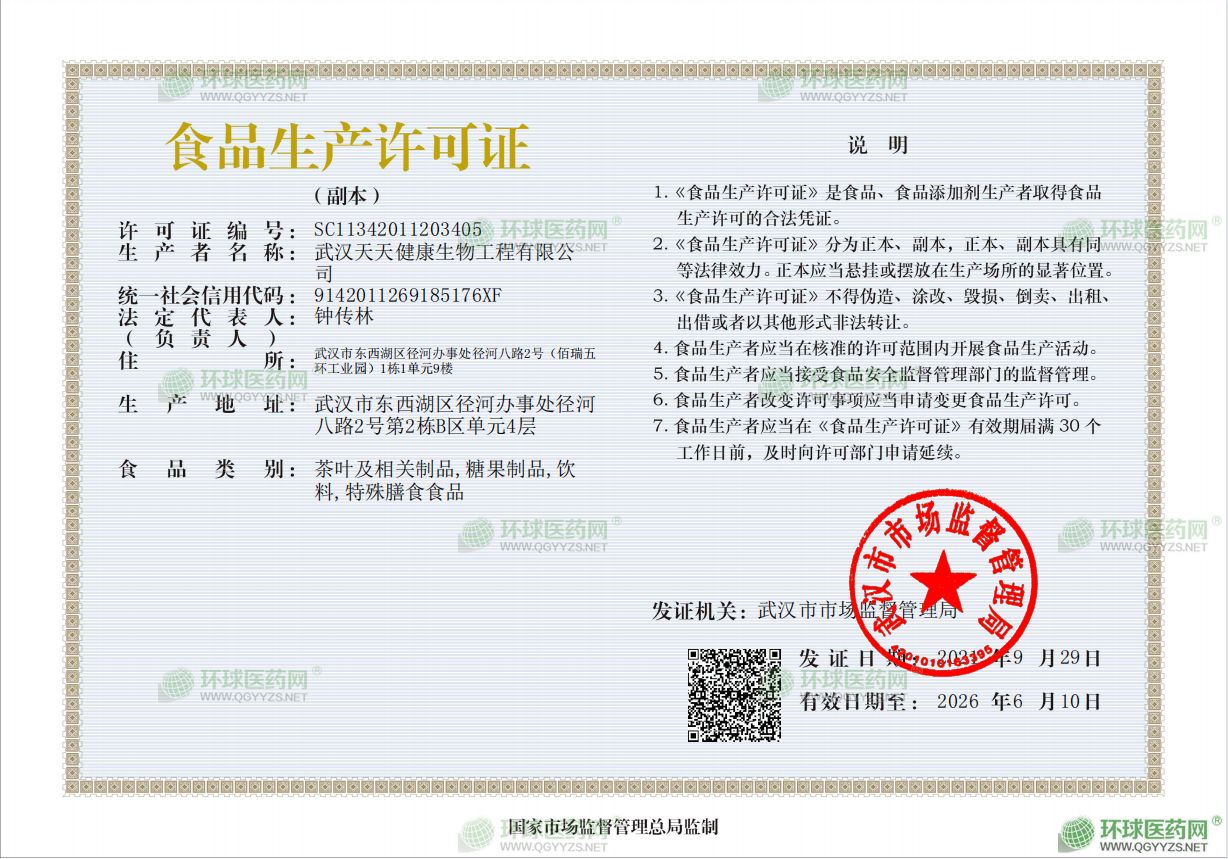 武汉天天健康生物工程有限公司,早成立于1999年,是美国天天健康集团下设的专业公司,美国天天健康集团涉及到汽车、化工、房地产、酒店、医药、化妆品行业上市集团,在全球拥有员工上万人。是一家集科研、生产、销售为一体的高新技术企业。2015年,公司为了更大的发展,在临空经济开发区-东西湖吴家山新建了厂房,并一次性通过GMP认证。设备齐全,技术力量雄厚。公司秉着“诚信服务、质量求精、信誉、品牌”的经营理念,与北京中科院研究所,湖北省中医学院合作,不断地研发,生产制造更加优质的产品。2012年,公司引进八条袋泡茶生产线,专注于生产**袋泡茶、代用茶、花草茶、绿茶、红茶。**产品现正在中。可OEM代加工单室袋泡茶、双室袋泡茶、三角包袋泡茶。有全套的粉碎和超微粉碎、分筛、烘干、灭菌、制粒、制袋等设备,严格的生产工艺和灭菌杀毒(高温辐照消毒与紫外线红外线多重杀菌),日均生产能力可达200万袋,在我公司加工合作的企业达上千家。
