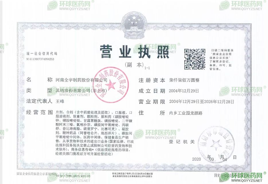 河南全宇制药股份有限公司系有上海全宇生物科技内乡制药有限公司整体改制而来,始建于2002年1月,位于内乡工业园区,原名南阳全宇制药有限公司,2005年更名为上海全宇生物科技内乡制药有限公司。2014年5月份改制为股份有限公司,并更名为河南全宇制药股份有限公司。公司注册资本5000万元,注册地址和生产地址位于内乡县工业园区,北邻312国道,西临湍河,东、南均为农田,厂区周围无污染源,环境优美,空气新鲜,厂区植草绿化,道路平整。水、电、汽供应充足,具备药品生产的良好环境。公司现有厂址现占地面积五十余亩,公司拥甘露聚糖肽原料药车间、化学合成原料药车间、口服液体制剂车间、中药前处理及提取车间、软膏剂车间和片剂车间。新厂区占地240亩,计划于2015年底建成投产,规划新建自动化生产车间八个,综合办公楼一栋,研发、化验楼一栋,员工宿舍楼二栋,仓库四个,以及锅炉房等辅助建筑。总建筑面积98433.5㎡。计划产能:年产原料药300吨、片剂30亿片、口服液1亿支、软膏剂300万支,中药前处理165吨。产品达产后,可实现年产值产值10亿,利税1.5亿元。