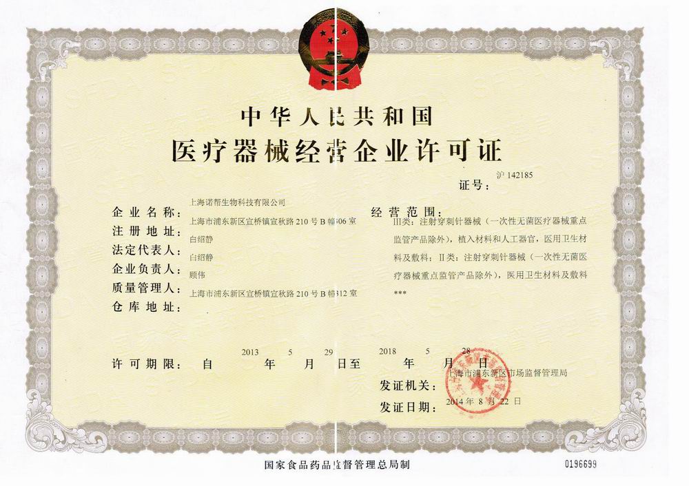 上海诺帮生物科技有限公司创建于1999年,是一家致力于内窥镜下医用耗材、医学生物活性材料、仿生医学修复材料、再生医学与组织工程领域研发、生产及销售的企业。总部坐落于高新技术企业云集的上海浦东新区,拥有3000㎡以上GMP标准建设的现代化厂房和实验中心,并已申报欧盟CE认证和ISO13485:2012国际质量体系认证、美国FDA认证。