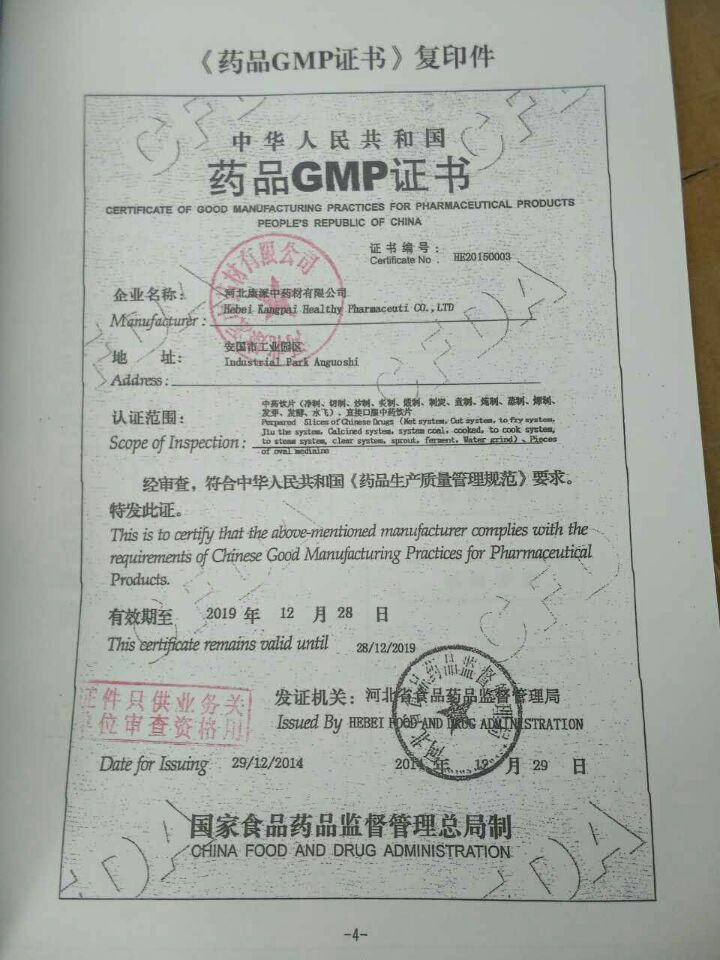 河北康派中药材有限公司始建于2005年,坐落在安国市工业城园区保衡路东侧。按照GMP标准设计建设,公司占地近20亩,建筑面积8800余平米,注册资金500万元。公司经营范围为中药饮片、口服中药饮片、农副产品收购,主营业务为中药饮片生产,是集现代化中药饮片生产、经营、销售为一体的民营企业。公司现有职工86人,中级职称技术人员16名,初级以上职称20人。占职工人数42%。