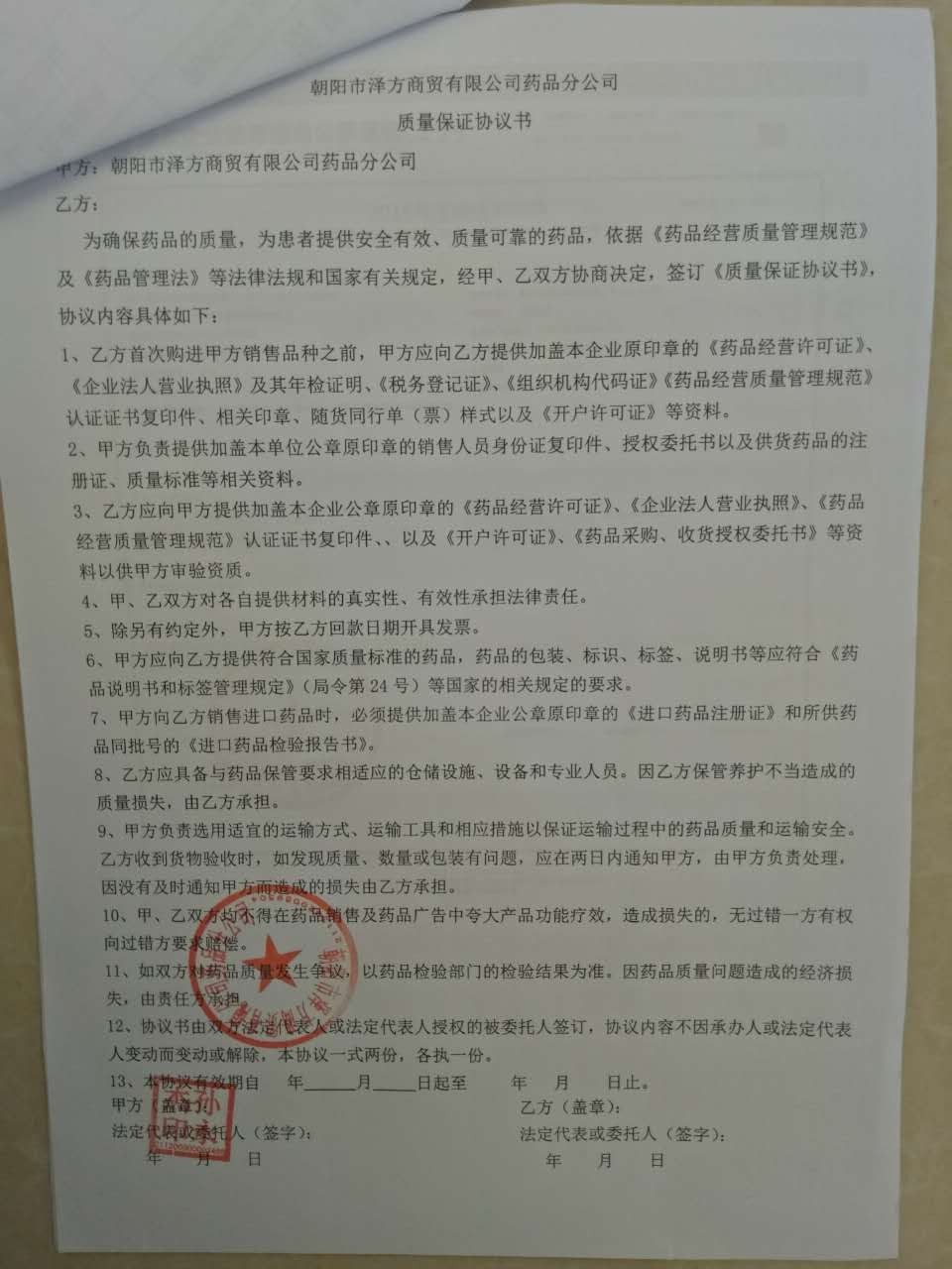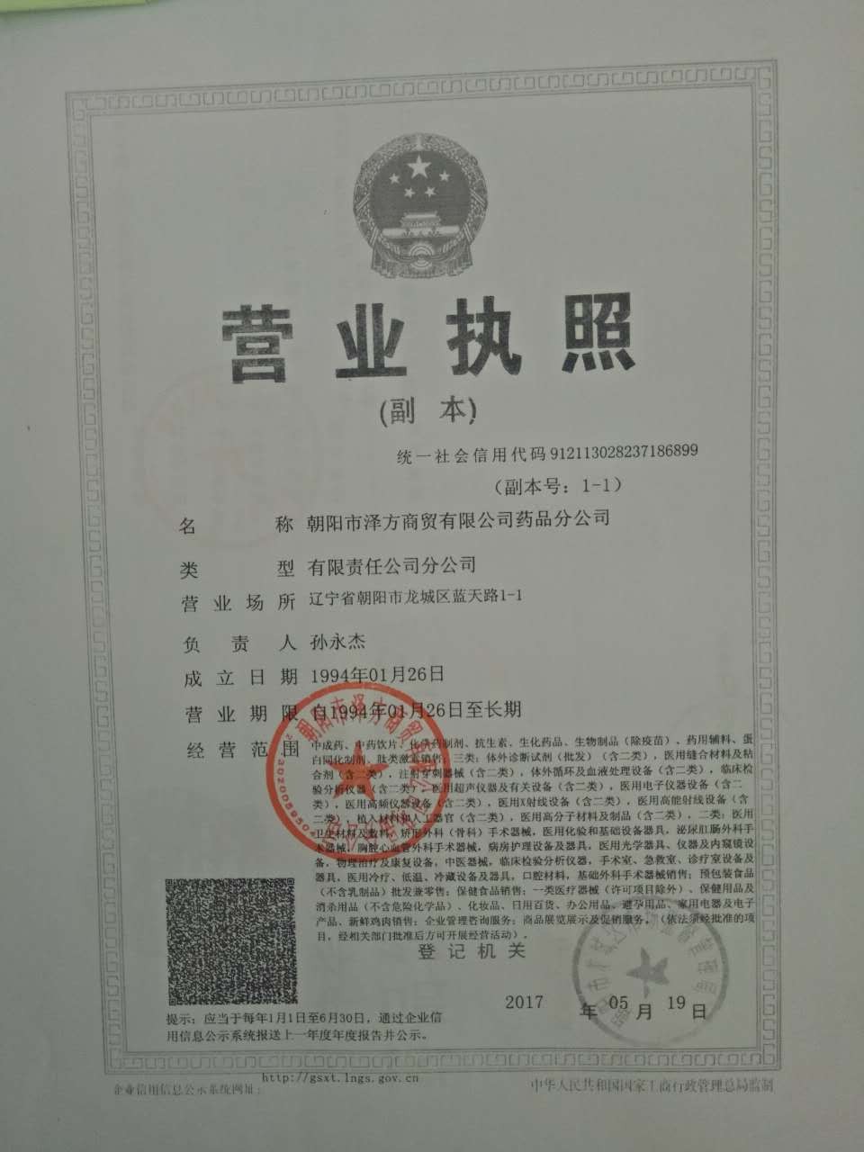 朝阳市泽方商贸有限公司成立于2013年2月,位于美丽的三燕古都,历史文化名城辽宁省朝阳市。企业注册资金1000万元,主要经营:家用医疗器械、家用医疗耗材、医用设备(医疗机构设备投放合作)、医用耗材、体外诊断试剂、保健食品、消杀用品。公司于2015年1月投资成立药品分公司,主要经营:中成药、中药饮片、化学药制剂、抗生素、生化药品、生物制品(不含疫苗),药用辅料。公司销售客户主要为市、县、乡镇级公立及私营医疗机构、药品连锁公司、药品批发公司、个体零售药店、社区卫生服务站。目前销售网络覆盖朝阳、锦州、阜新、葫芦岛及沈阳市区。公司经营的产品以区域代理控销为主,有专业的销售人员及完善的售后保障。