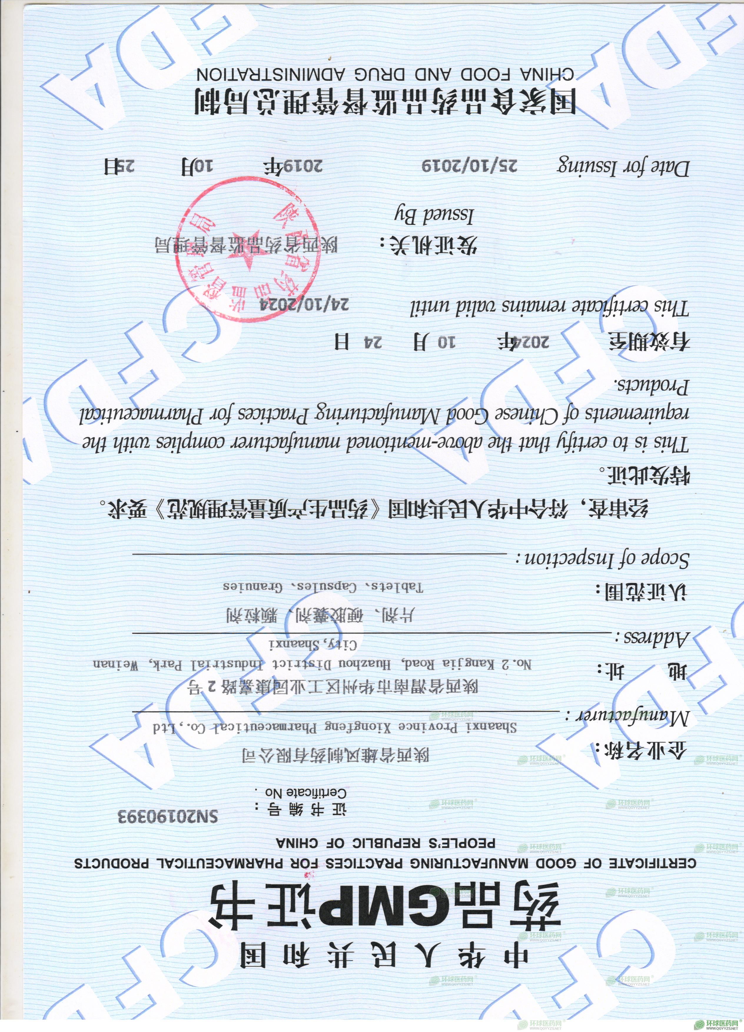 发证机关: 陕西省药品监督管理局