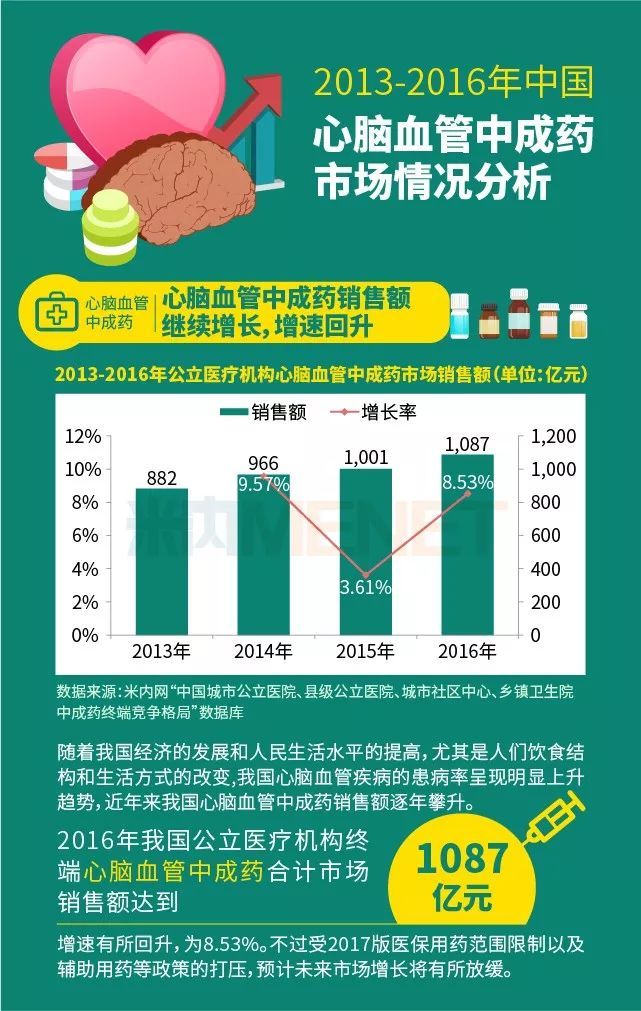 心脑血管疾病的高发也让心脑血管用药市场逐年扩增,根据调查显示,2016年我国心脑血管疾病中成药总销售额为1087亿元,是名副其实的千亿市场,其中的商机无限,不可小觑。
