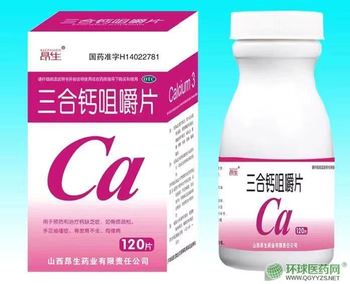 - 三合钙咀嚼片昂生 批准文号: 国药准字H14022781规 格: 每片含乳酸钙、葡萄糖酸钙、磷酸氢钙各0.05克