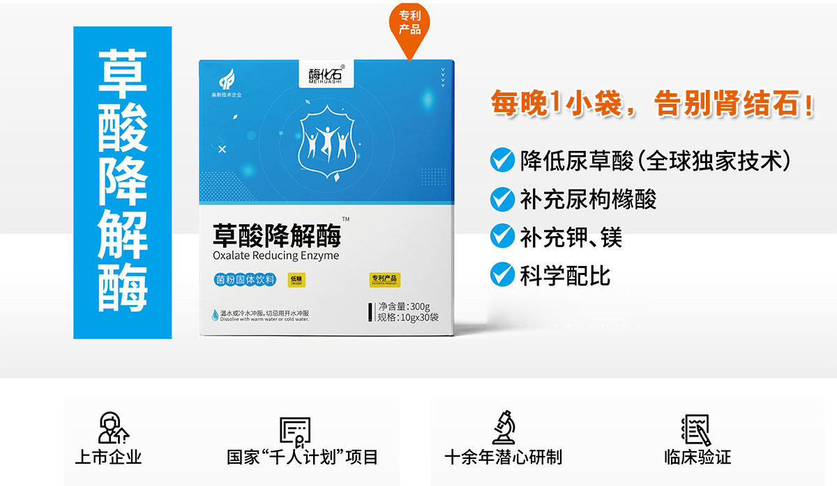 泌尿系结石-草酸降解酶独家专利产品全国火热招商中! 20个人里就有一个肾结石,其中80%是草酸钙结石。20%患者每1-2年复发一次,发病率还在逐年增长。 为响应国家号召,国家“千人计划”专家李青山博士,回国创办康复得生物科技股份有限公司,带来了肾结石防治领域核心技术,成功研发出【酶化石】草酸降解酶,开创