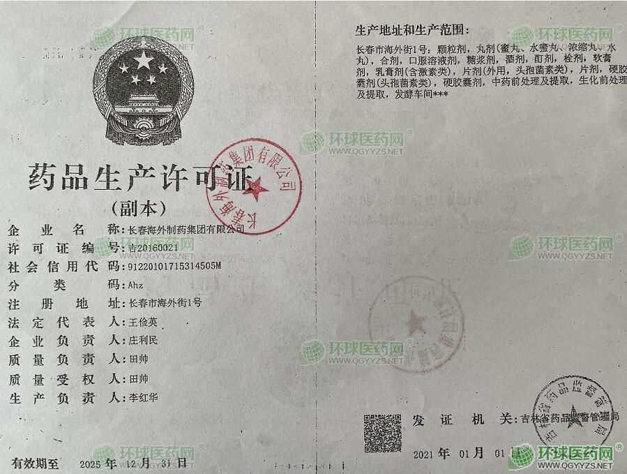 长春海外制药集团有限公司首批通过国家GMP认证,根据《药品生产质量管理规范(1998年修订)》的要求兴建了符合GMP标准的大型药业生产基地,并与同期建立了GMP生产和质量管理体系。