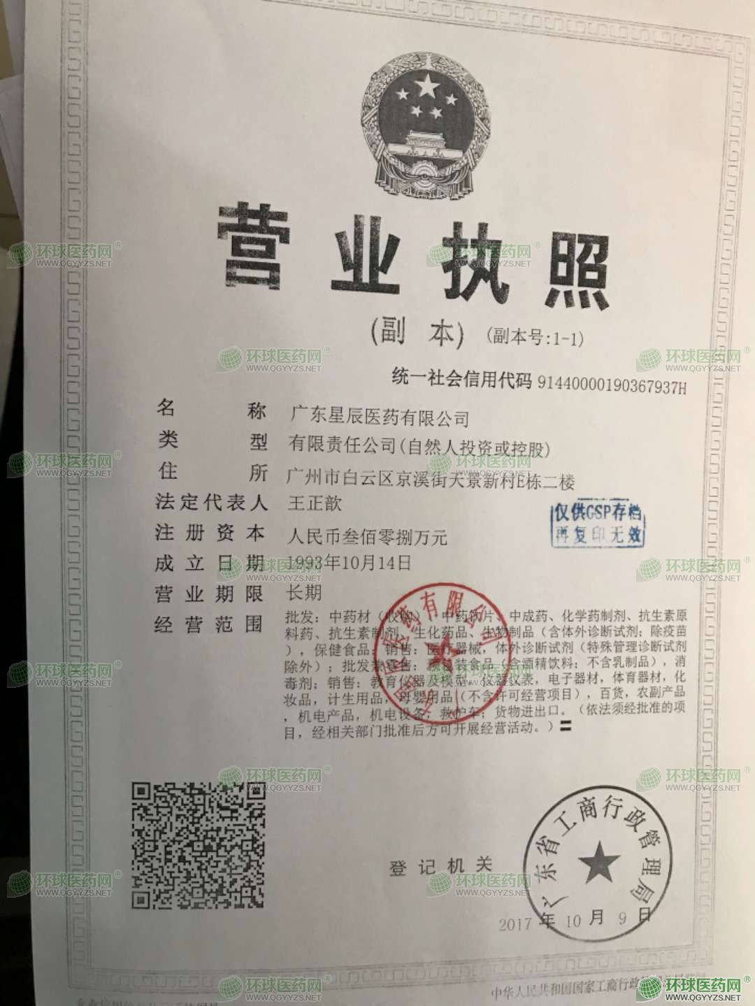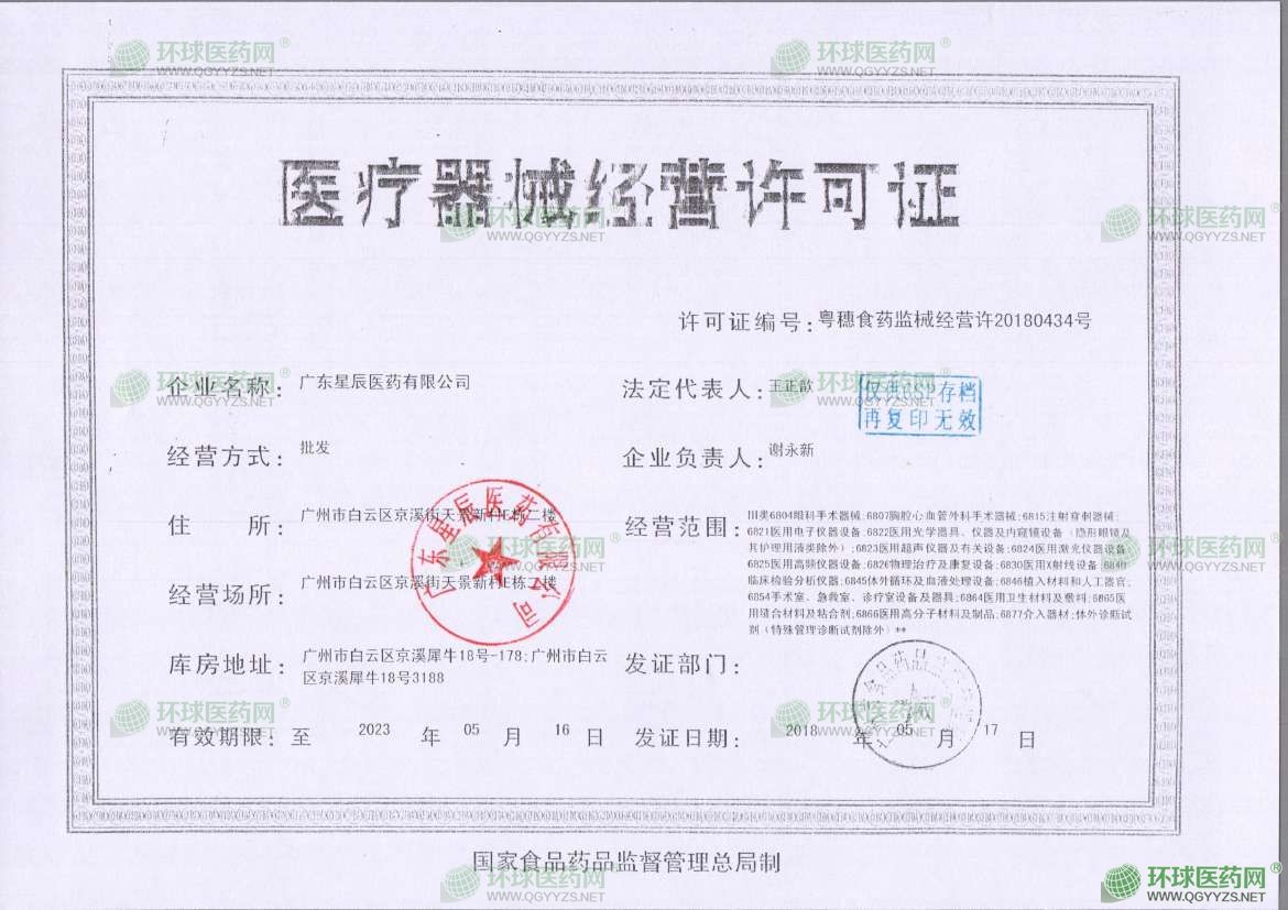 广东星辰医药有限公司成立于1993年10月14日,注册地位于广州市白云区京溪街天景新村E栋二楼,法定代表人为王正歆。经营范围包括批发:中药材(收购)、中药饮片、中成药、化学药制剂、抗生素原料药、抗生素制剂、生化药品、生物制品(含体外诊断试剂;除疫苗),保健食品;销售:医疗器械,体外诊断试剂(特殊管理诊断试剂除外);批发兼零售:预包装食品(含酒精饮料;不含乳制品),消毒剂;销售:教育仪器及模型,仪器仪表,电子器材,体育器材,化妆品,计生用品,母婴用品(不含许可经营项目),百货,农副产品,机电产品,机电设备,救护车;货物进出口。