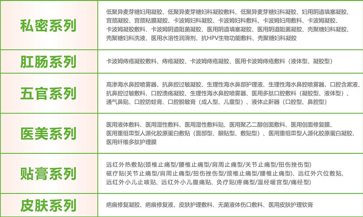 集团业务板块主要有:二类医疗器械、消字号、妆字号、保健食品、健字号、日用号等大健康全系列产品。佰氏健康集团拥有的二类医疗器械批文有上百个,涉及私密系列、肛肠系列、五官系列、医美系列、贴膏系列、皮肤系列等。涉及的产品可见下图。