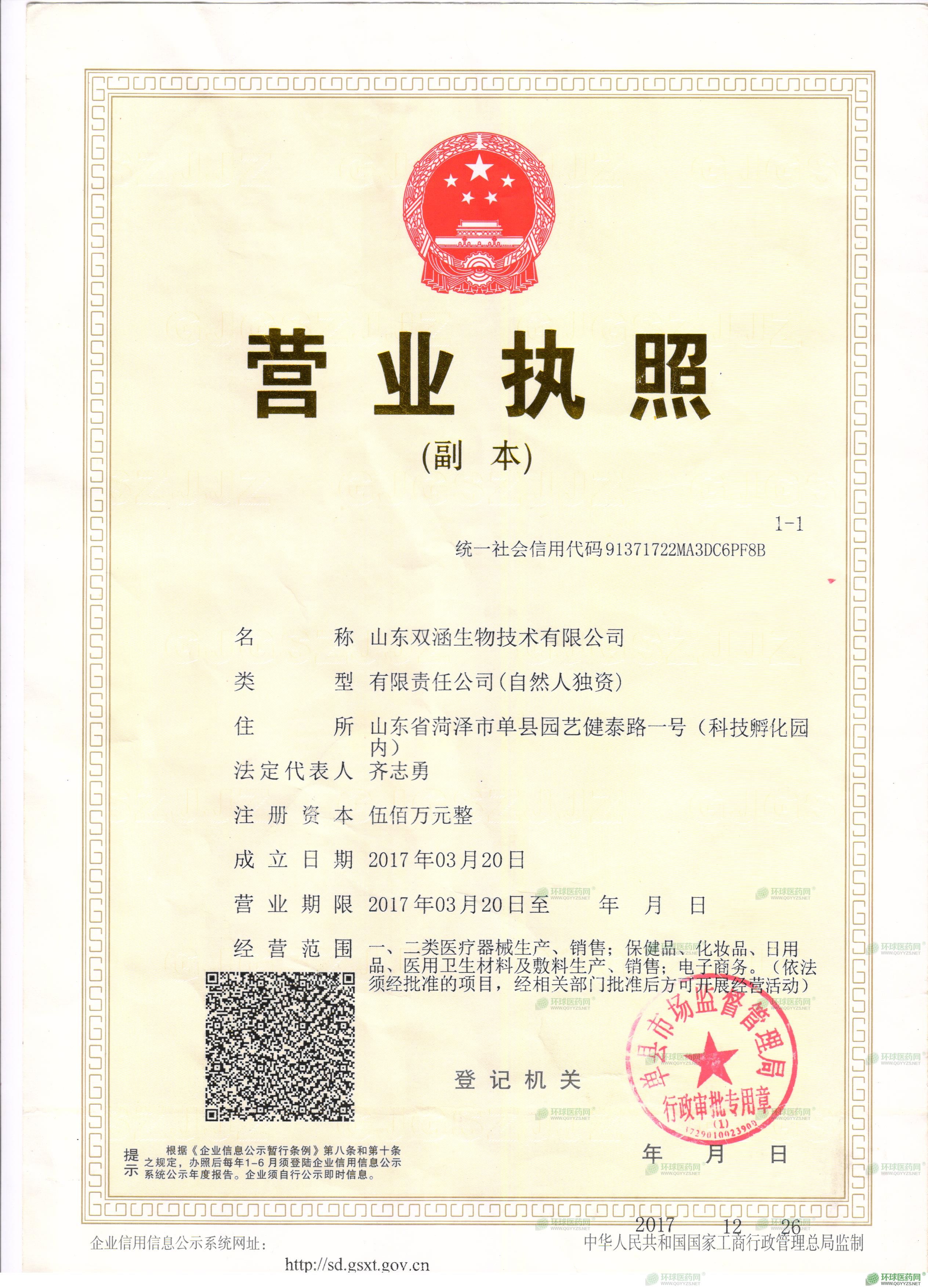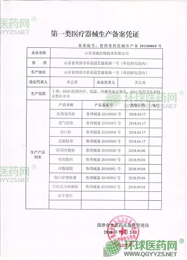 山东双涵生物技术有限公司始创于2017年,是一家集研发、生产、销售于一体、按高起点,高标准建立起来的创新型现代化企业,座落于苏鲁豫皖四省八县交界之处、著名长寿之乡——中国单县。注册资金500万元,拥有在册员工50人,科研人员5人,本科及以上10人。公司以“保护健康、造福社会”为企业使命,以“品质至上、科学发展”为企业核心价值观,以“传承、创新、和谐、奉献”为企业精神,以“务实、求严、高效、诚信”为企业作风。公司拥有规模化生产基地,主营产品:医用退热贴、透气胶贴、创口贴、压敏胶带、医用冷敷贴、喷剂辅料、冷敷凝胶、伤口护理软膏、穴位压力刺激贴、医用冷敷眼罩、隔离衣、医用隔离鞋套、医用帽、液体敷料等。