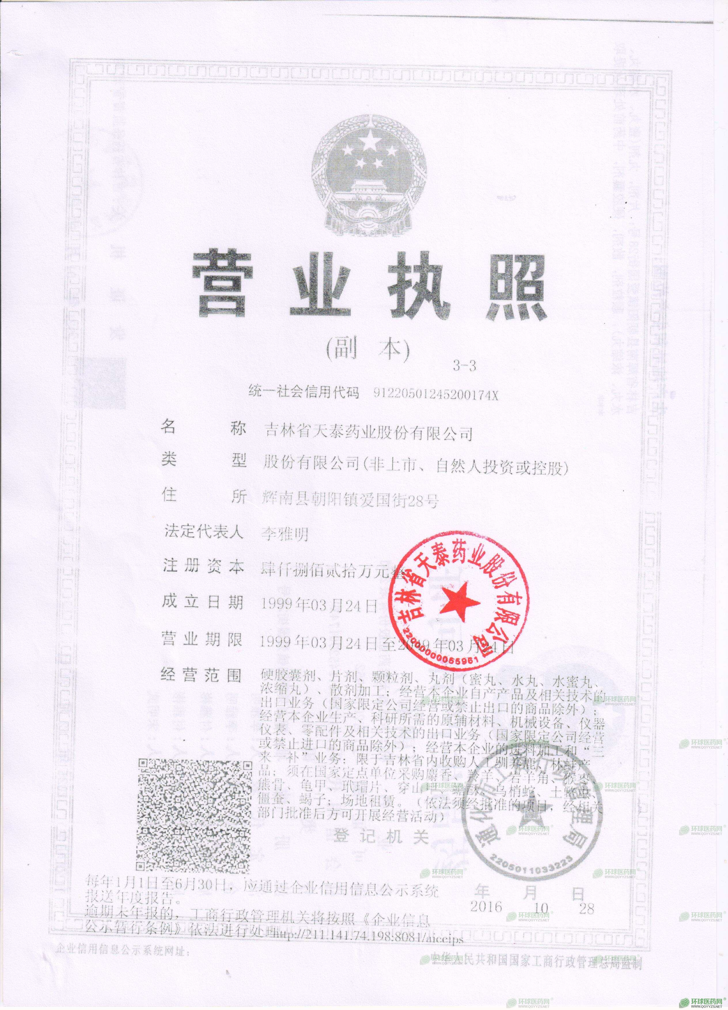 吉林省天泰药业股份有限公司原名吉林省辉南参鹿制药厂,始建于1982年。天泰药业是吉林省医药行业的骨干企业之一,经济效益曾连续十年列入吉林省医药行业前十名,被吉林省医药管理局评为“七五”、“八五”两个五年计划期间的先进企业。1996年1月5日,改组为吉林省辉南天泰药业有限责任公司。1996年11月18日,经股份制改造改制为吉林省辉南天泰药业股份有限公司。2009年7月,更名为吉林省天泰药业股份有限公司。三十多年来,吉林天泰药业通过改进产品工艺,更新生产设备,引进高新技术,积累了丰富的药品生产和管理经验,成为技术力量雄厚、生产工艺先进、设备仪器精良、检测手段完善,具有较强药品生产能力和研发能力的综合制药企业。