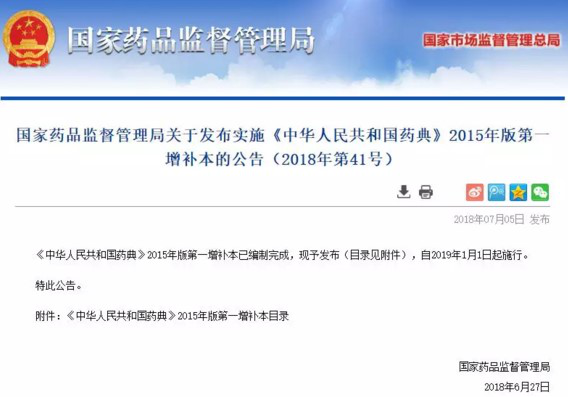 《中华人民共和国药典》2015年版**增补本已编制完成,现予发布(目录见附件),自2019年1月1日起施行。 特此公告。