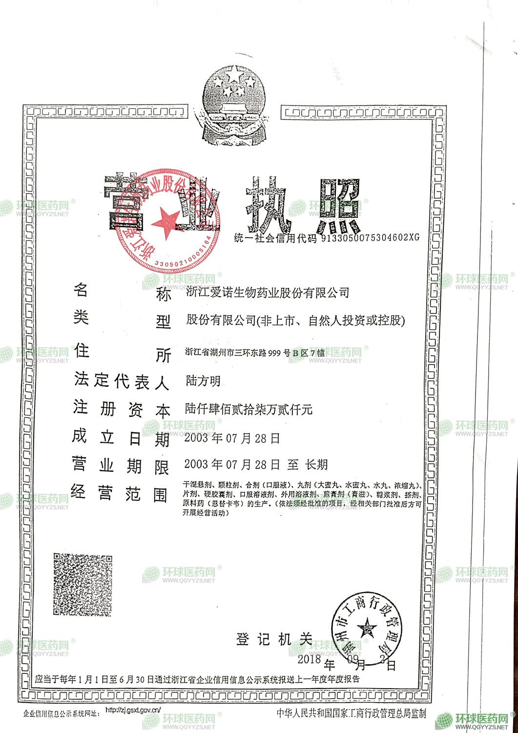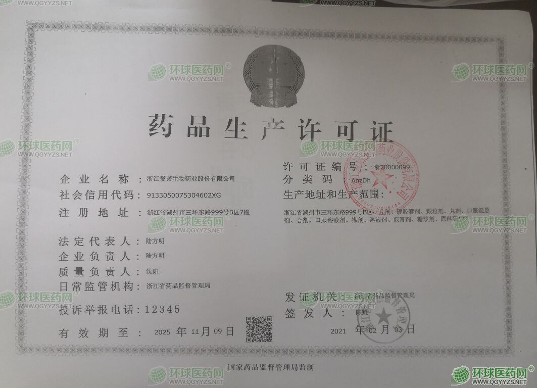 生产范围: 浙江省湖州市三环东路999号B区:片剂、硬胶囊剂、颗粒剂、口服混悬剂、合剂、口服溶液剂、搽剂、糖浆剂、丸剂、原料药、煎膏剂、溶液剂***