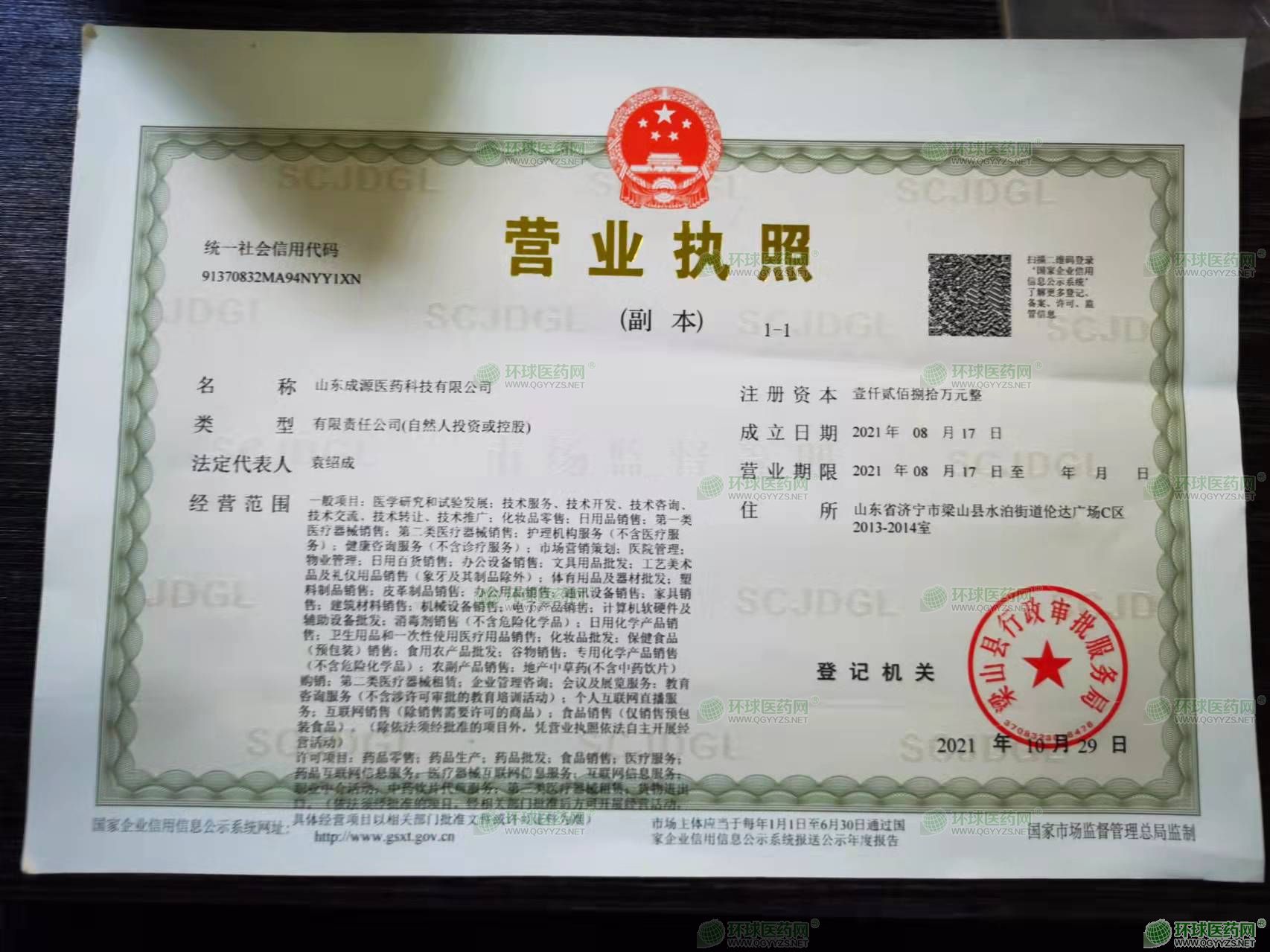 山东成源医药科技有限公司成立于2021年08月17日,注册地位于山东省济宁市梁山县水泊街道伦达广场C区2013-2014室,法定代表人为袁绍成。经营范围包括一般项目:医学研究和试验发展;技术服务、技术开发、技术咨询、技术交流、技术转让、技术推广;化妆品零售;日用品销售;**类医疗器械销售;第二类医疗器械销售;护理机构服务(不含医疗服务);健康咨询服务(不含诊疗服务);市场营销策划;医院管理;物业管理;日用百货销售;办公设备销售;文具用品批发;工艺美术品及礼仪用品销售(象牙及其制品除外);体育用品及器材批发;塑料制品销售;皮革制品销售;办公用品销售;通讯设备销售;家具销售;建筑材料销售;机械设备销售;电子产品销售;计算机软硬件及辅助设备批发;消毒剂销售(不含危险化学品);日用化学产品销售;卫生用品和一次性使用医疗用品销售;化妆品批发;保健食品(预包装)销售;食用农产品批发;谷物销售;专用化学产品销售(不含危险化学品);农副产品销售;地产中草药(不含中药饮片)购销;第二类医疗器械租赁;企业管理咨询;会议及展览服务;教育咨询服务(不含涉许可审批的教育培训活动);个人互联网直播服务;互联网销售(除销售需要许可的商品);食品销售(仅销售预包装食品)。(除依法须经批准的项目外,凭营业执照依法自主开展经营活动)许可项目:药品零售;药品生产;药品批发;食品销售;医疗服务;药品互联网信息服务;医疗器械互联网信息服务;互联网信息服务;职业中介活动;中药饮片代煎服务;第三类医疗器械租赁;货物进出口。(依法须经批准的项目,经相关部门批准后方可开展经营活动,具体经营项目以相关部门批准文件或许可证件为准)
