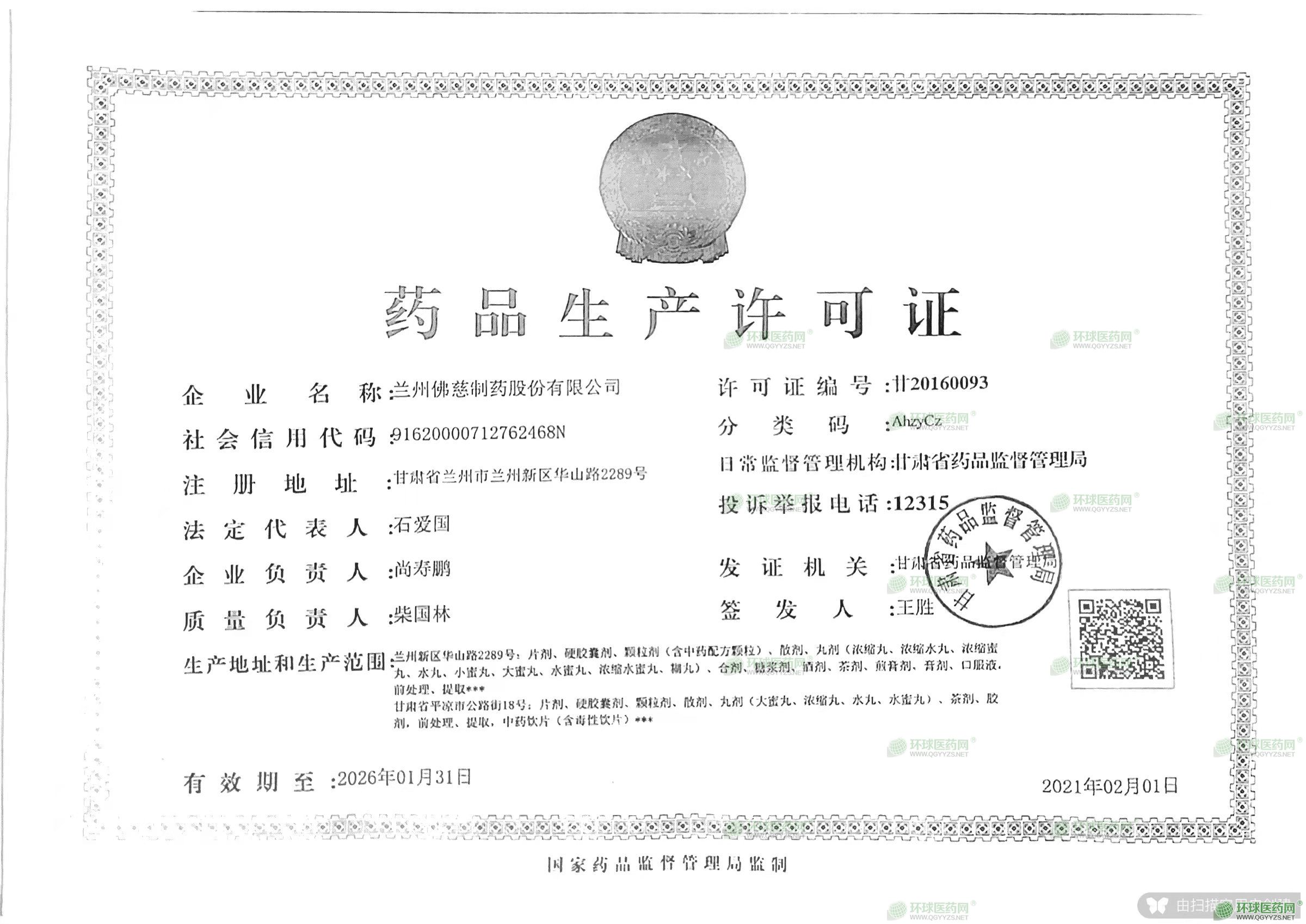 发证机关: 甘肃省药品监督管理局