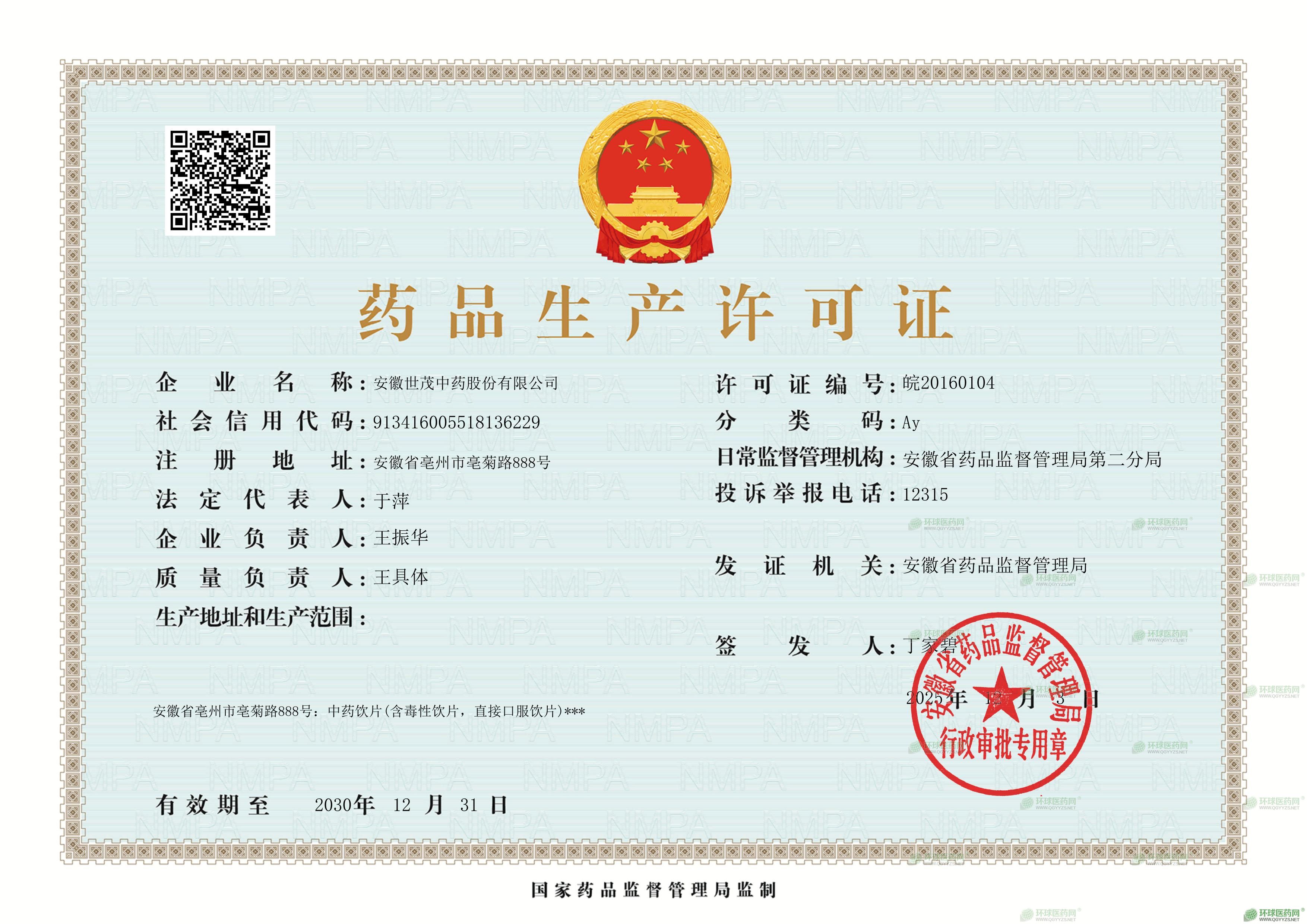 发证机关: 安徽省药品监督管理局