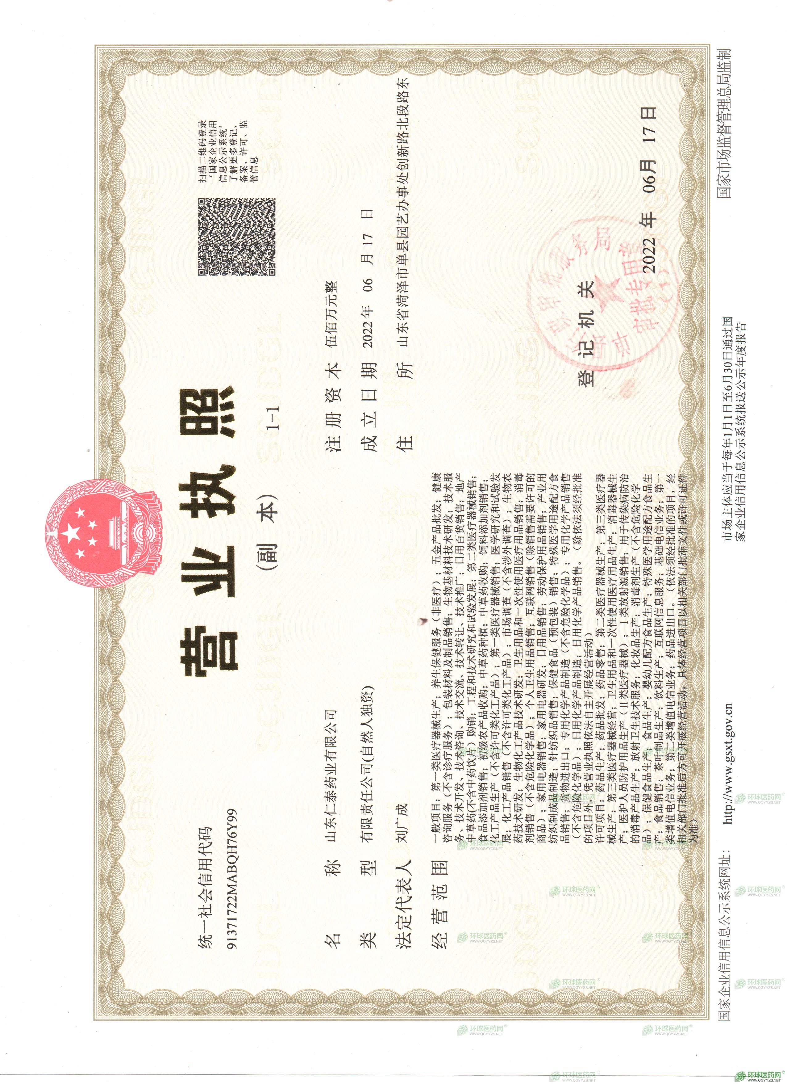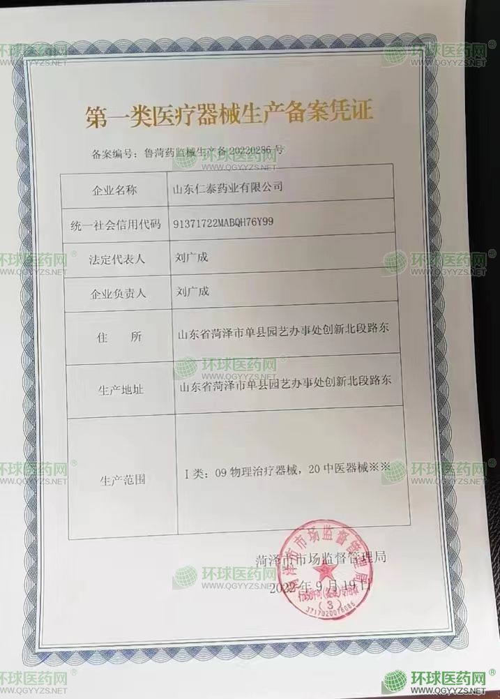 山东仁泰药业有限公司成立于2022年06月17日,注册地位于山东省菏泽市单县园艺办事处创新路北段路东,法定代表人为刘广成。经营范围包括**类医疗器械生产;养生保健服务(非医疗);五金产品批发;健康咨询服务(不含诊疗服务);包装材料及制品销售;生物基材料技术研发;技术服务、技术开发、技术咨询、技术交流、技术转让、技术推广;日用百货销售;地产中草药(不含中药饮片)购销;工程和技术研究和试验发展;第二类医疗器械销售;食品添加剂销售;初级农产品收购;中草药种植;中草药收购;饲料添加剂销售;化工产品生产(不含许可类化工产品);**类医疗器械销售;医学研究和试验发展;化工产品销售(不含许可类化工产品);市场调查(不含涉外调查);生物农药技术研发;生物化工产品技术研发;卫生用品和一次性使用医疗用品销售;消毒剂销售(不含危险化学品);个人卫生用品销售;互联网销售(除销售需要许可的商品);家用电器销售;家用电器研发;日用品销售;劳动保护用品销售;产业用纺织制成品制造;针纺织品销售;保健食品(预包装)销售;特殊医学用途配方食品销售;货物进出口;专用化学产品制造(不含危险化学品);专用化学产品销售(不含危险化学品);日用化学产品制造;日用化学产品销售。(除依法须经批准的项目外,凭营业执照依法自主开展经营活动)许可项目:药品生产;药品批发;药品零售;第二类医疗器械生产;第三类医疗器械生产;第三类医疗器械经营;卫生用品和一次性使用医疗用品生产;消毒器械生产;医护人员防护用品生产(Ⅱ类医疗器械);Ⅰ类放射源销售;用于传染病防治的消毒产品生产;放射卫生技术服务;化妆品生产;消毒剂生产(不含危险化学品);保健食品生产;食品生产;婴幼儿配方食品生产;特殊医学用途配方食品生产;食品销售;茶叶制品生产;饮料生产;互联网信息服务;基础电信业务;**类增值电信业务;第二类增值电信业务;药品进出口。(依法须经批准的项目,经相关部门批准后方可开展经营活动,具体经营项目以相关部门批准文件或许可证件为准)