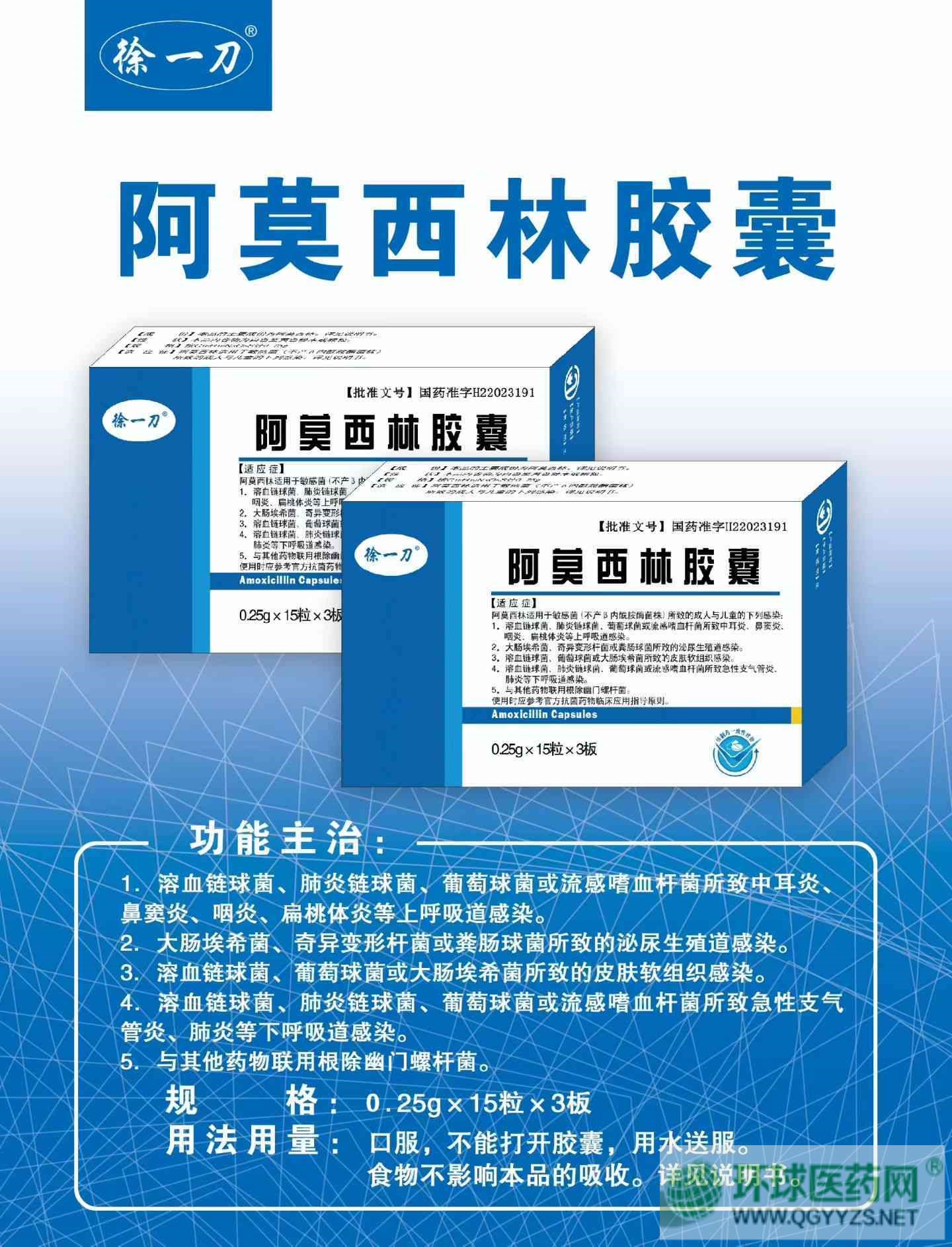 - 阿莫西林胶囊(徐一刀) 批准文号: 国药准字H22023191规 格: 0.25g*15粒*3板